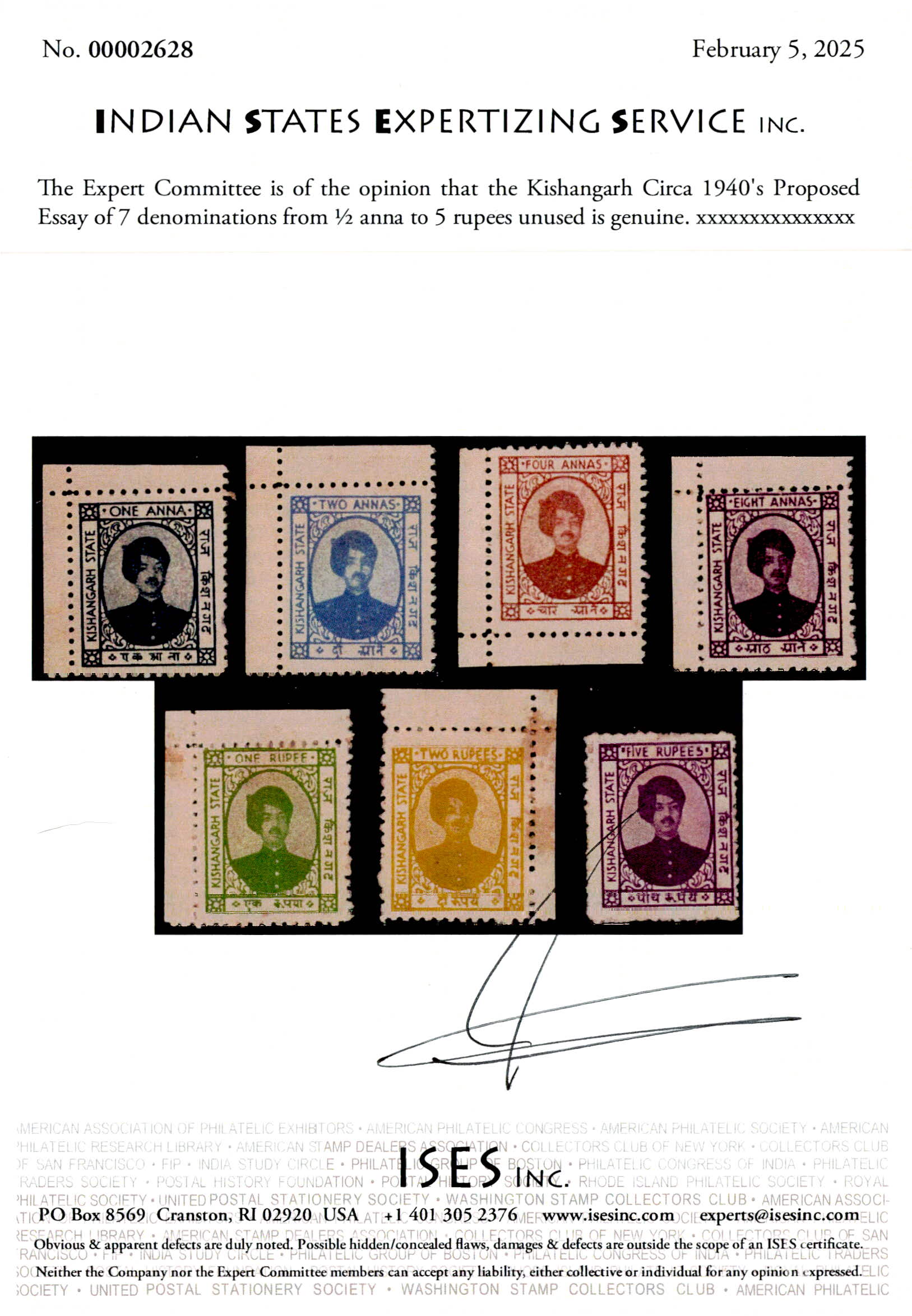 Circa 1940's Proposed Essay of 7 denominations from ½ anna to 5 rupees. First time we have seen this in 40 years, possibly unique set in private hands. 2025 ISES certificate.