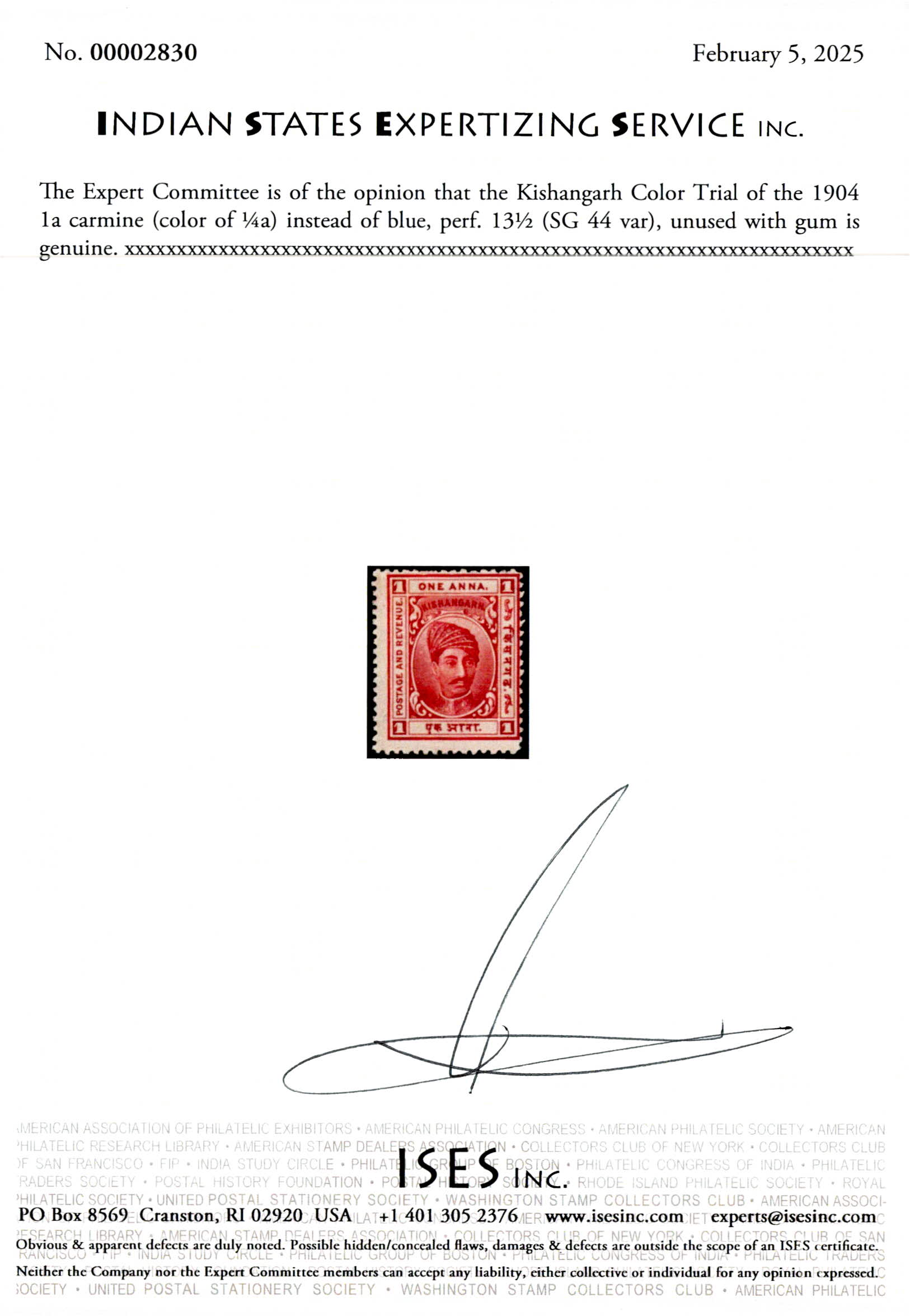 Color Trial of the 1904 1a carmine (color of ¼a) instead of blue, perf. 13½. 2025 ISES certificate.