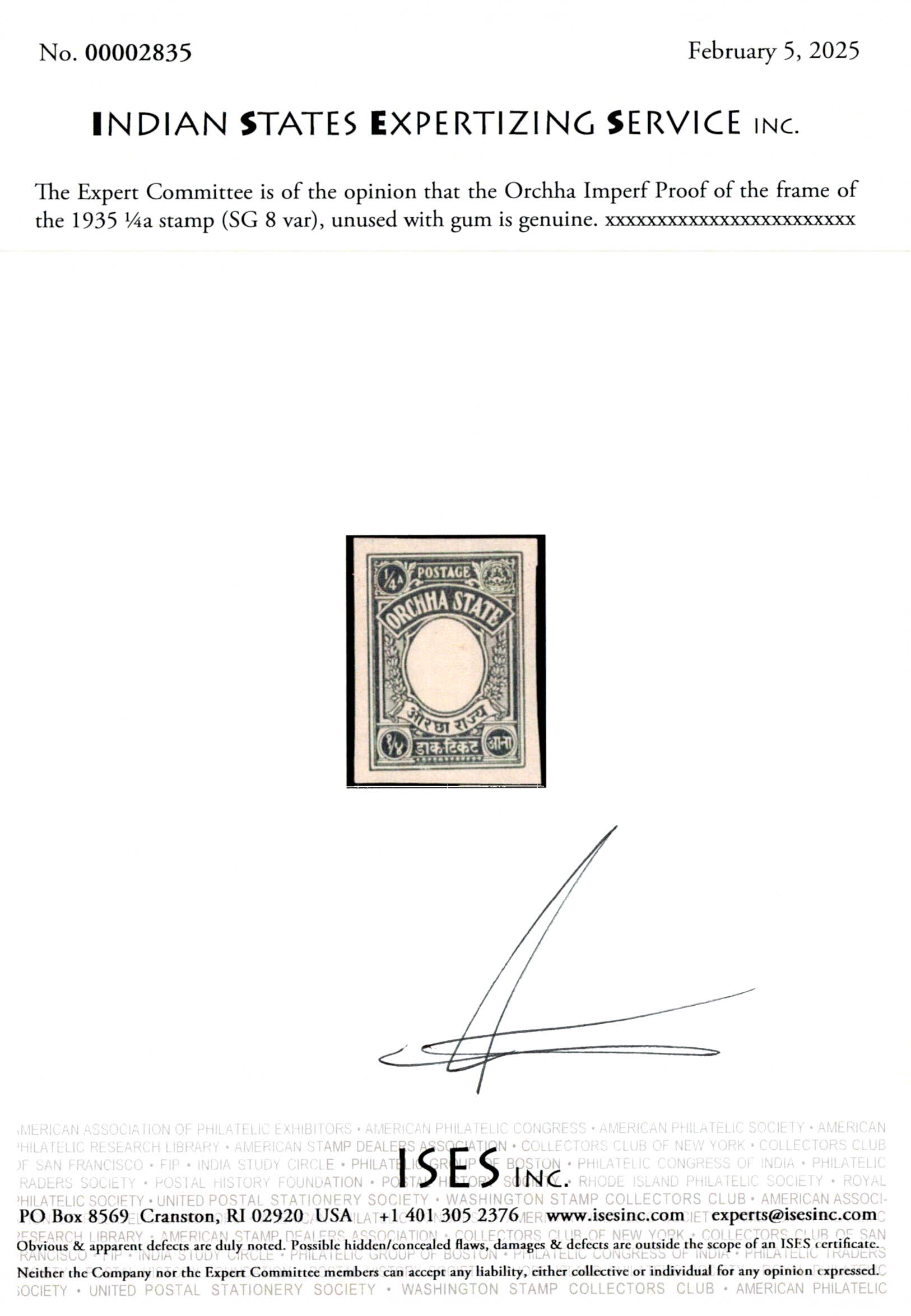 Imperf Proof of the frame of the 1935 ¼a stamp. 2025 ISES certificate.