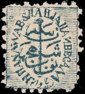 1884 ¼a greenish blue perforated with error, 'ANAWAB' instead of NAWAB, unused without gum as issued. Ex. Dan Walker collection.