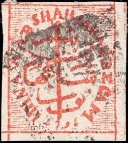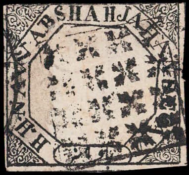 1881 ¼a black imperforate, with error, 'NWAB' instead of NAWAB. Used with fancy cancel. Minor thins. Ex. Dan Walker collection.