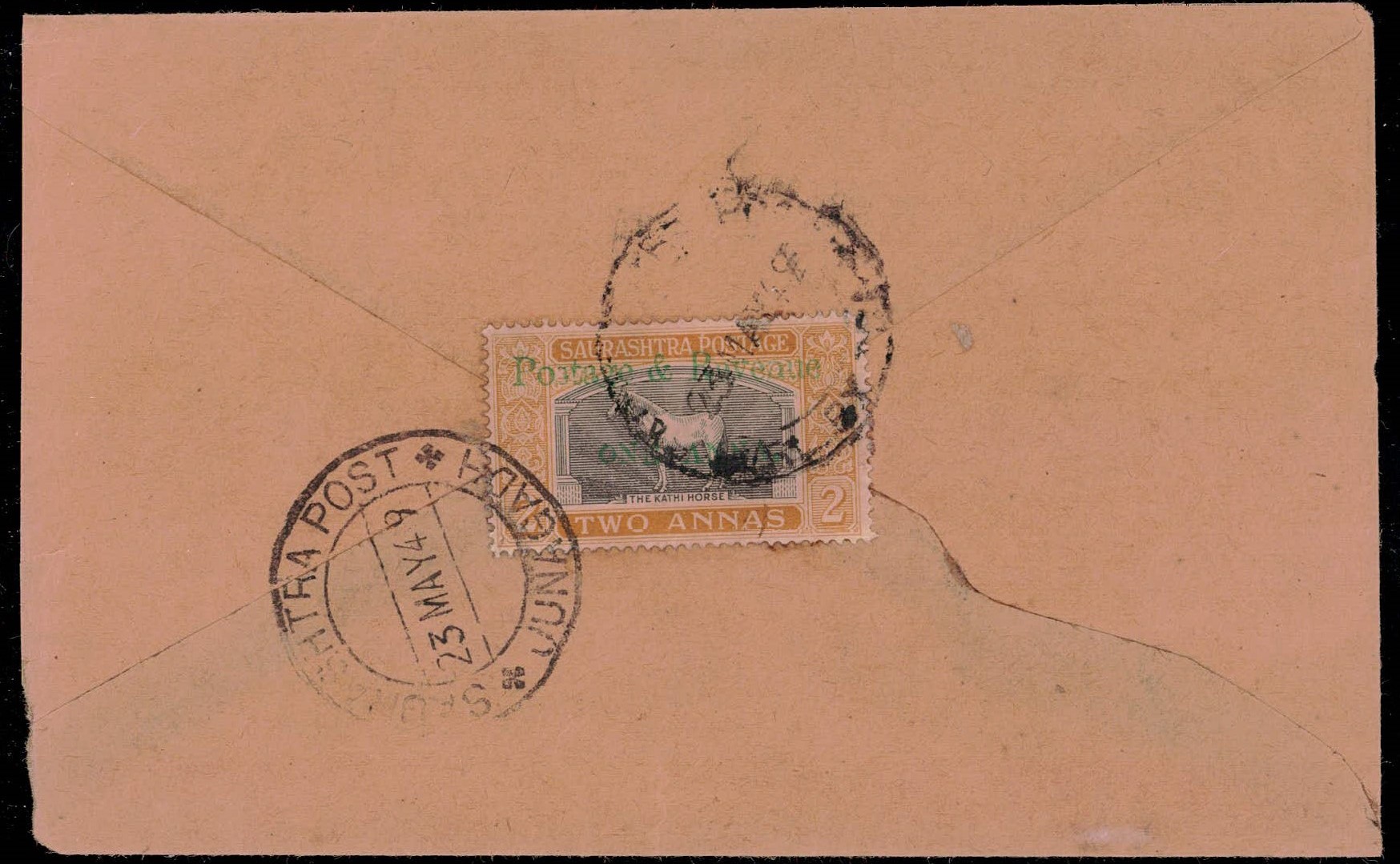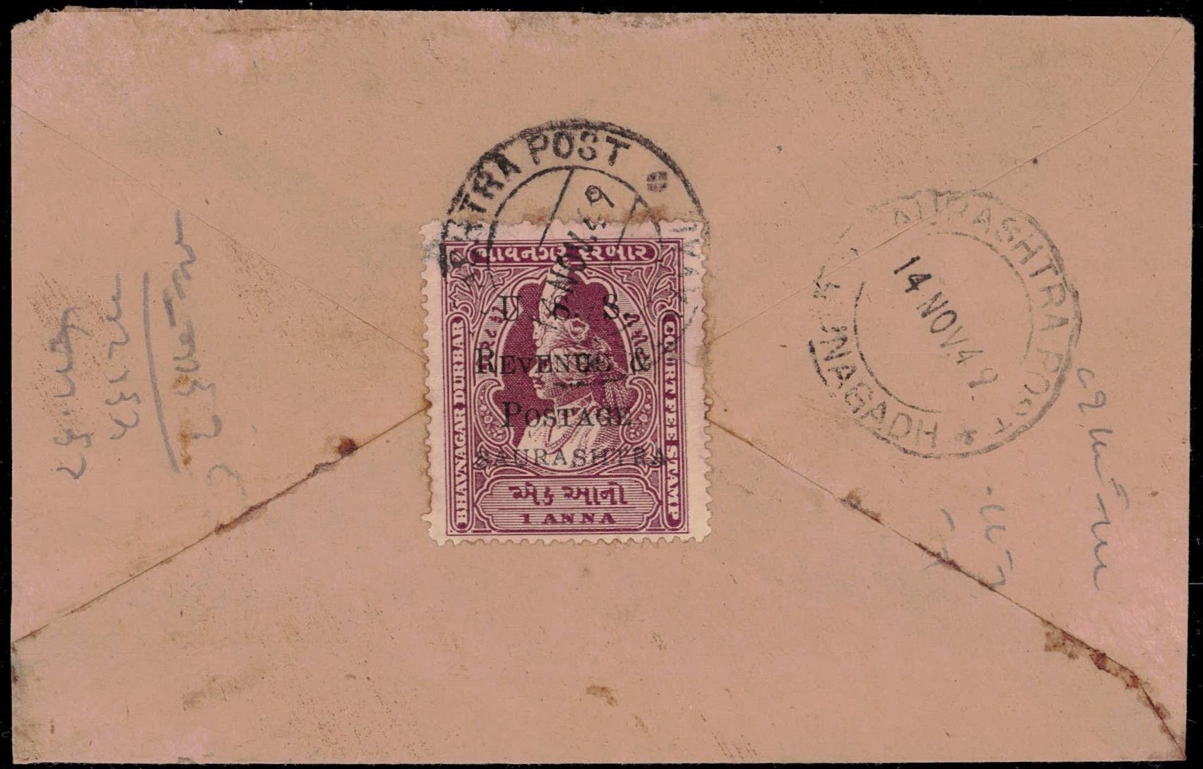 1949 1a Bhavnagar Court Fee stamp overprinted 'U. S. S. / REVENUE & / POSTAGE / SAURASHTRA' with error, small 'v' in REVENUE used on local cover dated 14 Nov. 49. Catalog value for normal stamp on cover £100. Ex. Dr. E.D. Pereira collection.