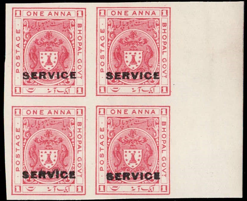 1932 Plate Proof of 1a carmine-red imperforate block of four overprinted 'SERVICE', unused without gum. Ex. Dan Walker collection.