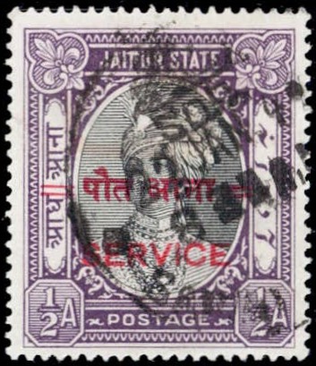 1948 ½a black & violet overprinted SERVICE with error, PAUT instead of PAUN anna surcharge and surcharge shifted upwards by 12mm. Used.