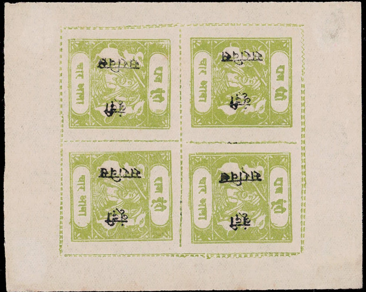 1917 4a yellow-green complete sheet of four from the mixed Setting; position 1 SG Type 'B', positions 2-4 SG Type 'C' with overprint in Devanagri Bundi Service in black sideways. A scarce Mixed Setting sheet. Unused without gum as issued. Catalog value as singles £92++
