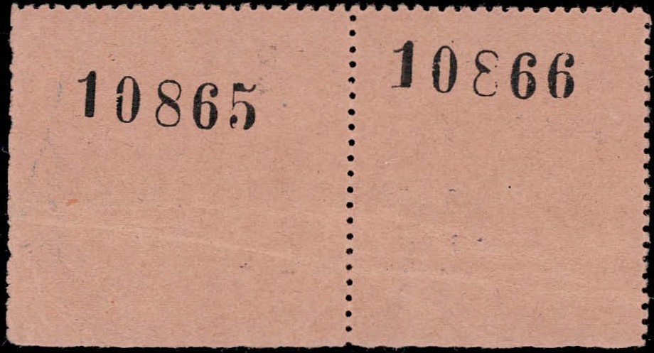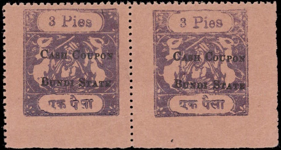 3p violet overprinted 'CASH COUPON / BUNDI STATE' horizontal pair with serial numbers 10865 & 10866 on reverse. Unused without gum as issued.