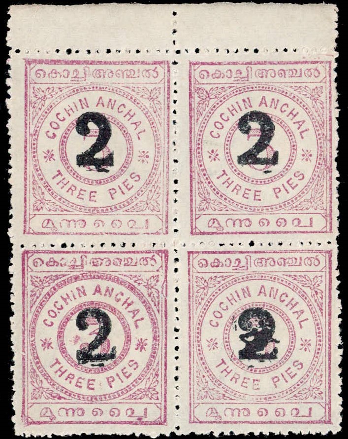 1909 3p rosy mauve corner marginal block of four surcharged '2' with error, deformed '2' in position 4. Unused without gum as issued.