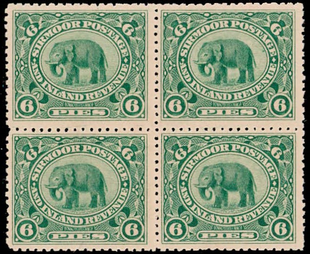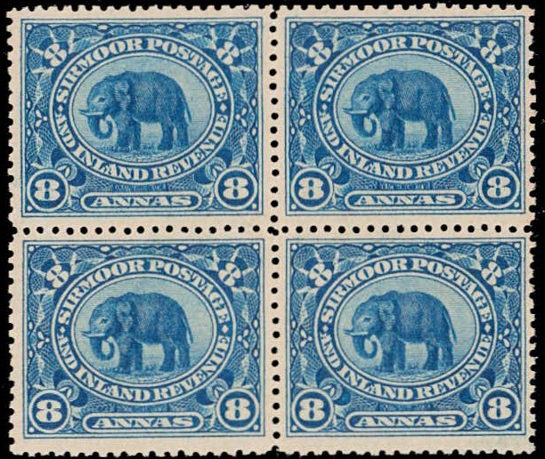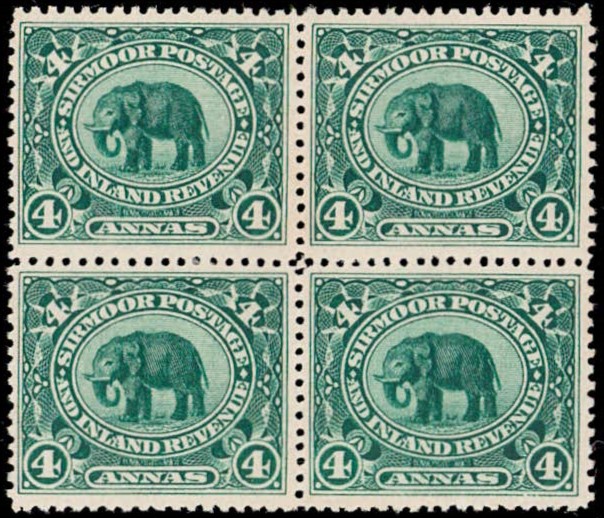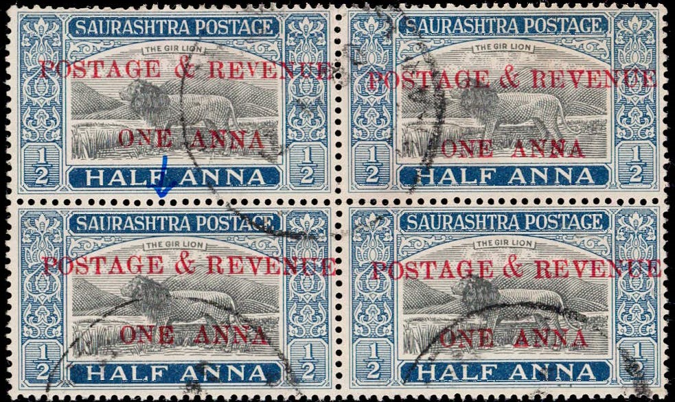 1949 ½a black & deep blue surcharged 'POSTAGE & REVENUE / ONE ANNA' block of four with error, small 'V' and small 'U' in REVENUE on the top left stamp. This error occurs once (Pos. 28) in a sheet of 40. Ex. Dr. E.D. Pereira collection.