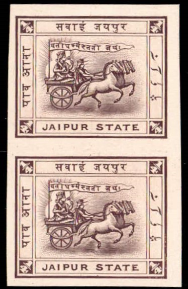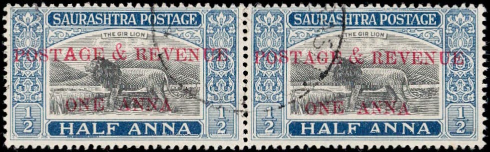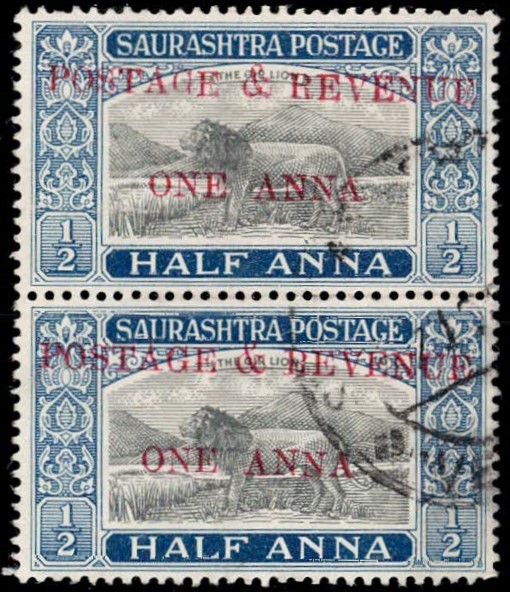 1949 ½a black & deep blue vertical pair surcharged 'POSTAGE & REVENUE / ONE ANNA' with error, small 'G' in POSTAGE on top stamp. This error occurs once in a sheet of 40. Ex. Dr. E.D. Pereira collection.