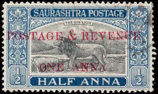 1949 ½a black & deep blue surcharged 'POSTAGE & REVENUE / ONE ANNA' with error, inverted 'N' in REVENUE and small last 'A' in ANNA. This error occurs once (Pos. 25) in a sheet of 40. Ex. Dr. E.D. Pereira collection.