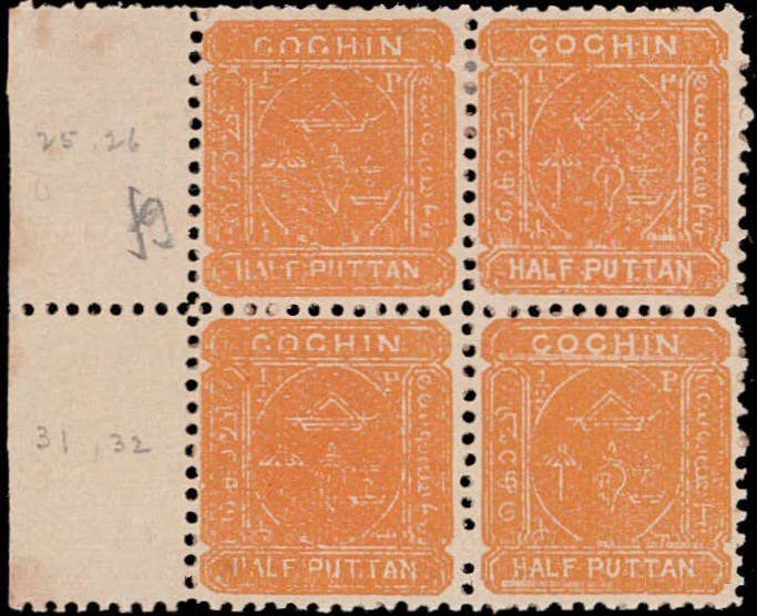1892 ½pu orange-buff without watermark left marginal block of four. Minor stains.