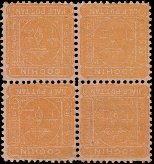 1950 Jaipur 1a black & blue overprinted RAJASTHAN, right corner marginal block of four, gum slightly toned.