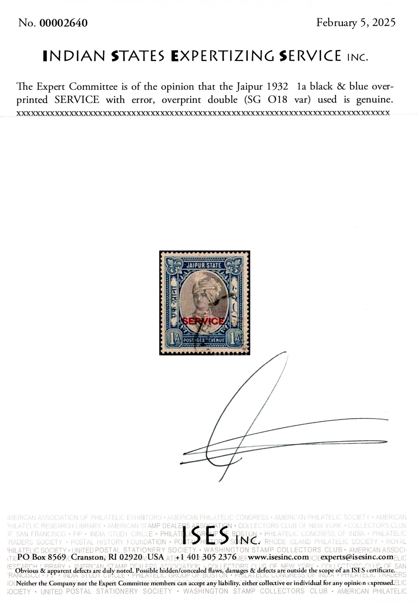1932 1a black & blue overprinted SERVICE with error, overprint double. This is the first such example we have handled in 40 years. 2025 ISES certificate.