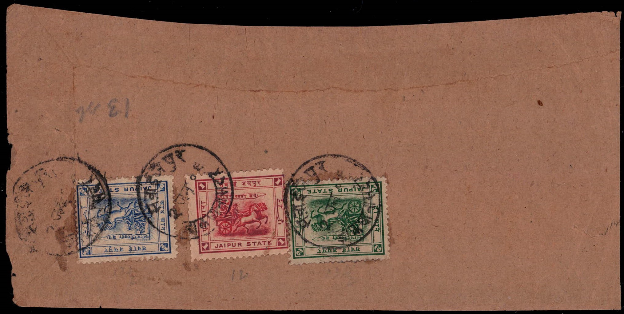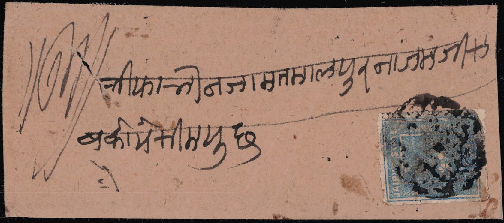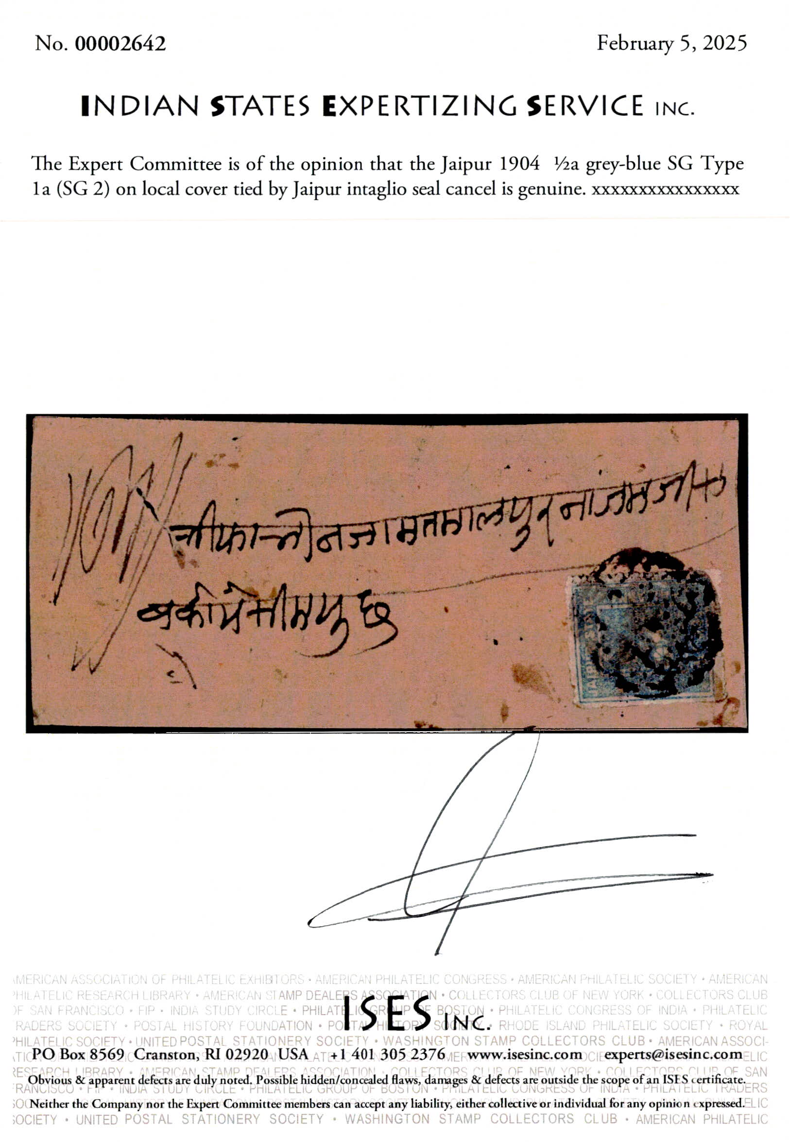 1904 ½a grey-blue SG Type 1a on local cover tied by Jaipur intaglio seal cancel. 2025 ISES certificate.