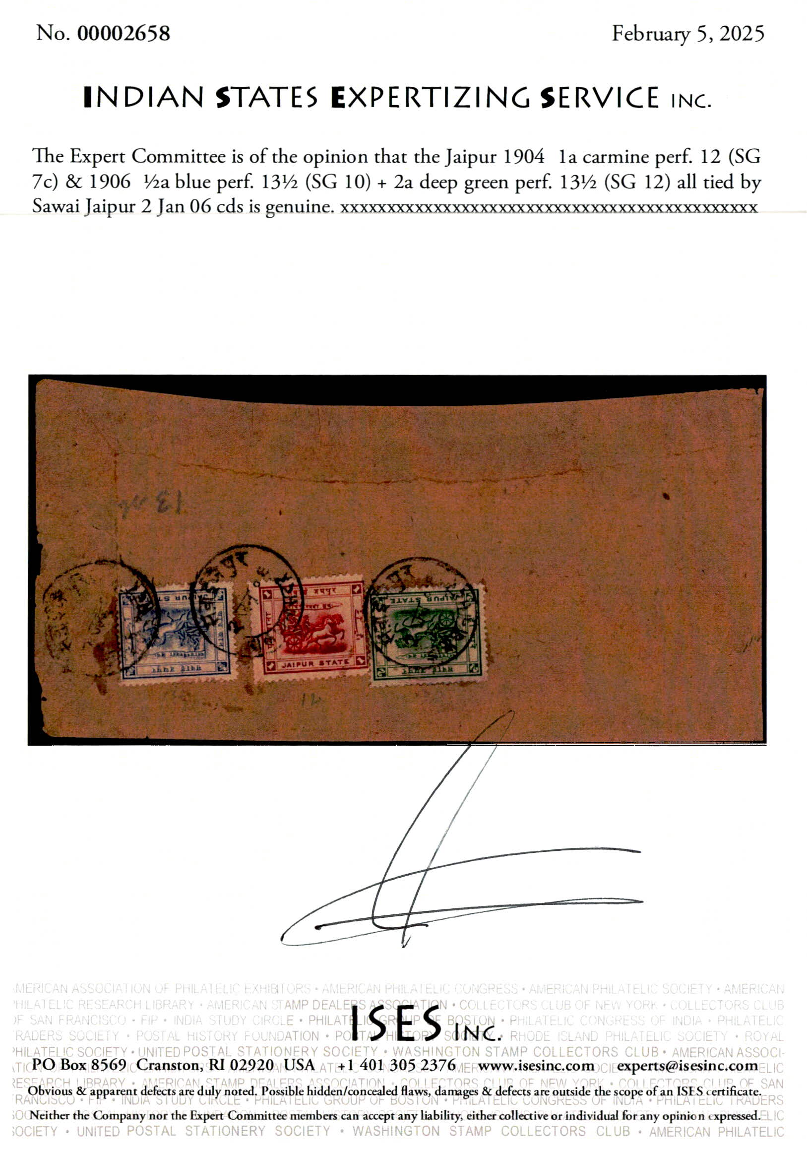 1904 1a carmine perf. 12 & 1906 ½a blue perf. 13½ + 2a deep green perf. 13½ on registered cover all tied by Sawai Jaipur 2 Jan 06 cds. Most certainly the earliest recorded usage of the 1906 issue. A spectacular three color franking. 2025 ISES certificate.