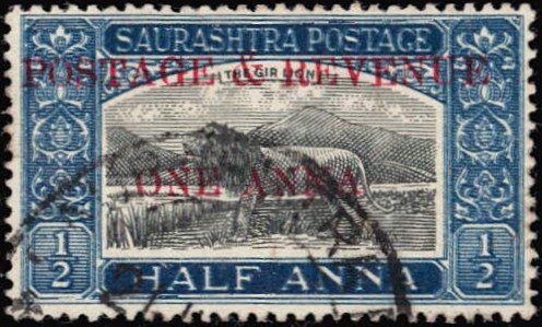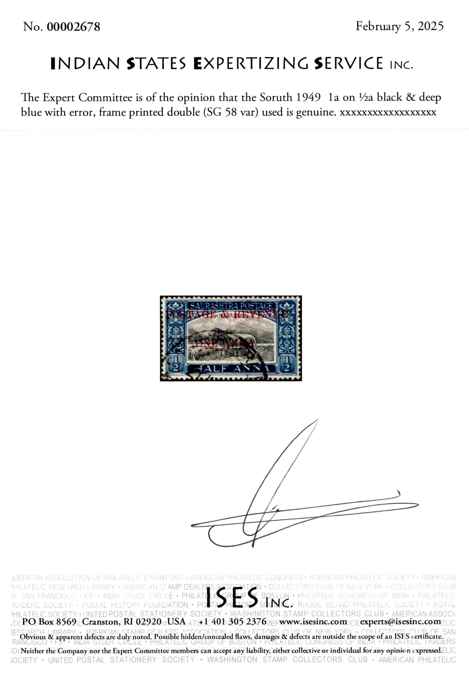 1949 ½a black & deep blue surcharged 'POSTAGE & REVENUE / ONE ANNA' with error, frame printed double. 2025 ISES certificate.