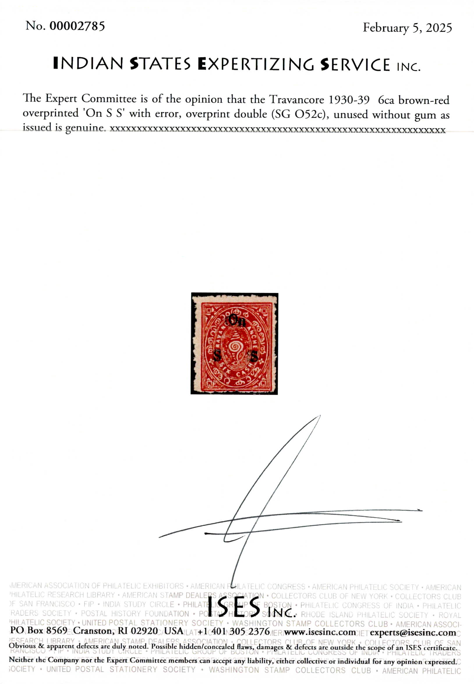 1930-39 6ca brown-red overprinted 'On S S' with error, overprint double. Unused without gum as issued. Discovery copy of this error in mint and most likely unique. 2025 ISES certificate.