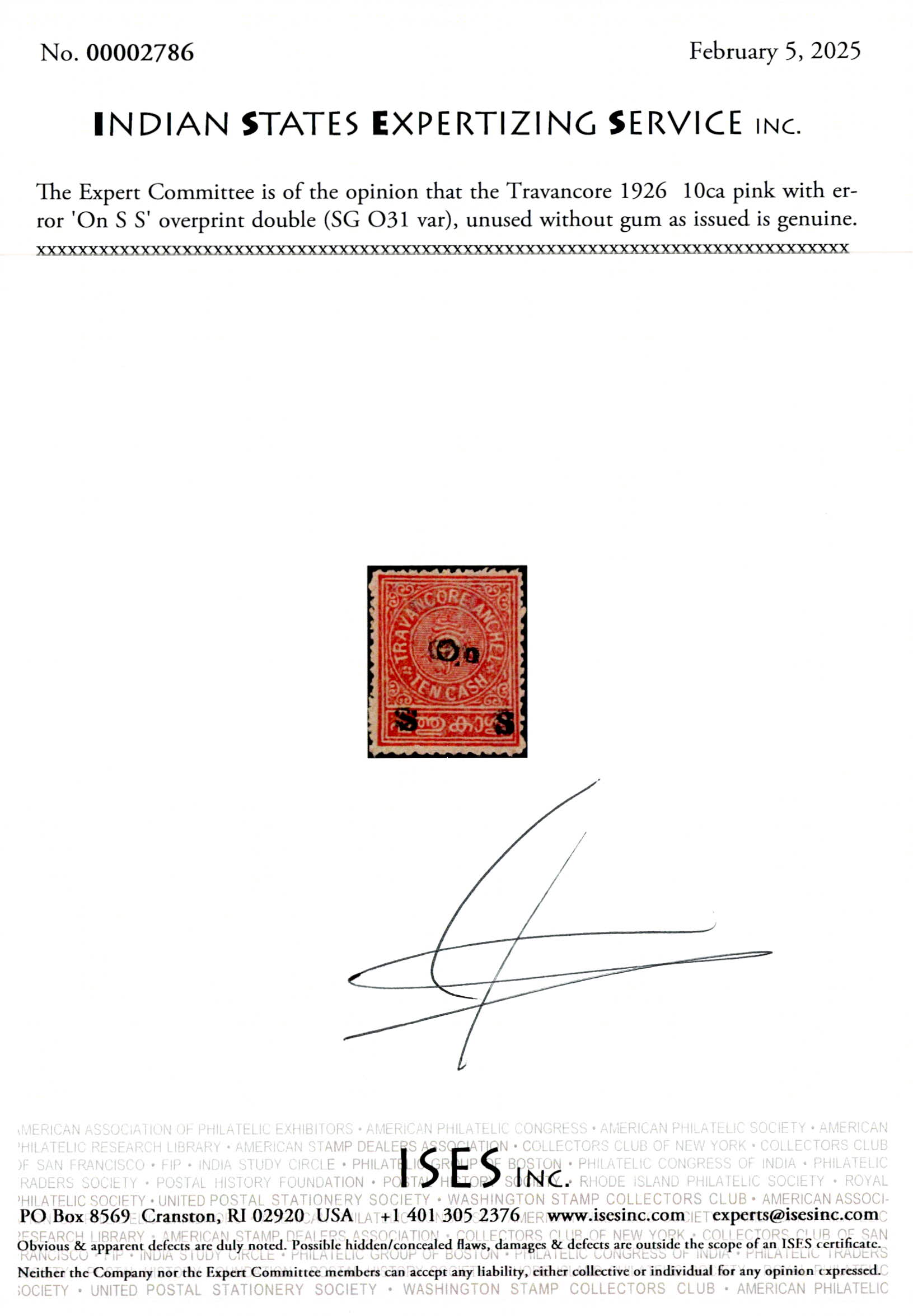 1926 10ca pink with error 'On S S' overprint double. Unused without gum as issued. Not listed in SG and possibly unique. 2025 ISES certificate.