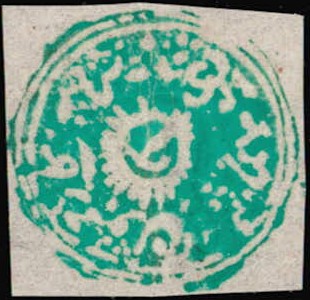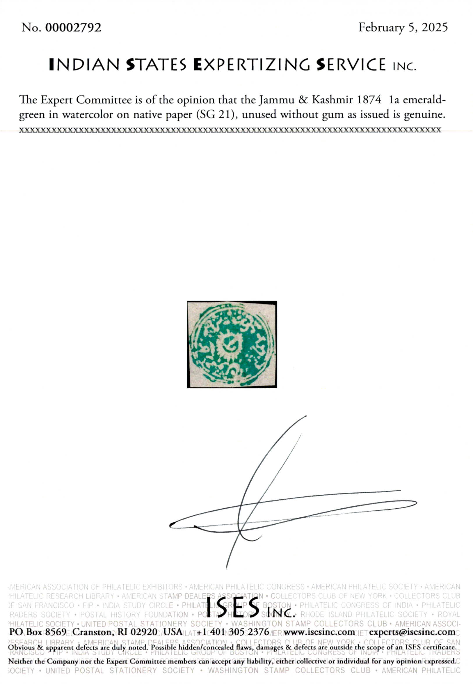 1874 1a emerald-green in watercolor on native paper. Unused without gum as issued. 2025 ISES certificate.