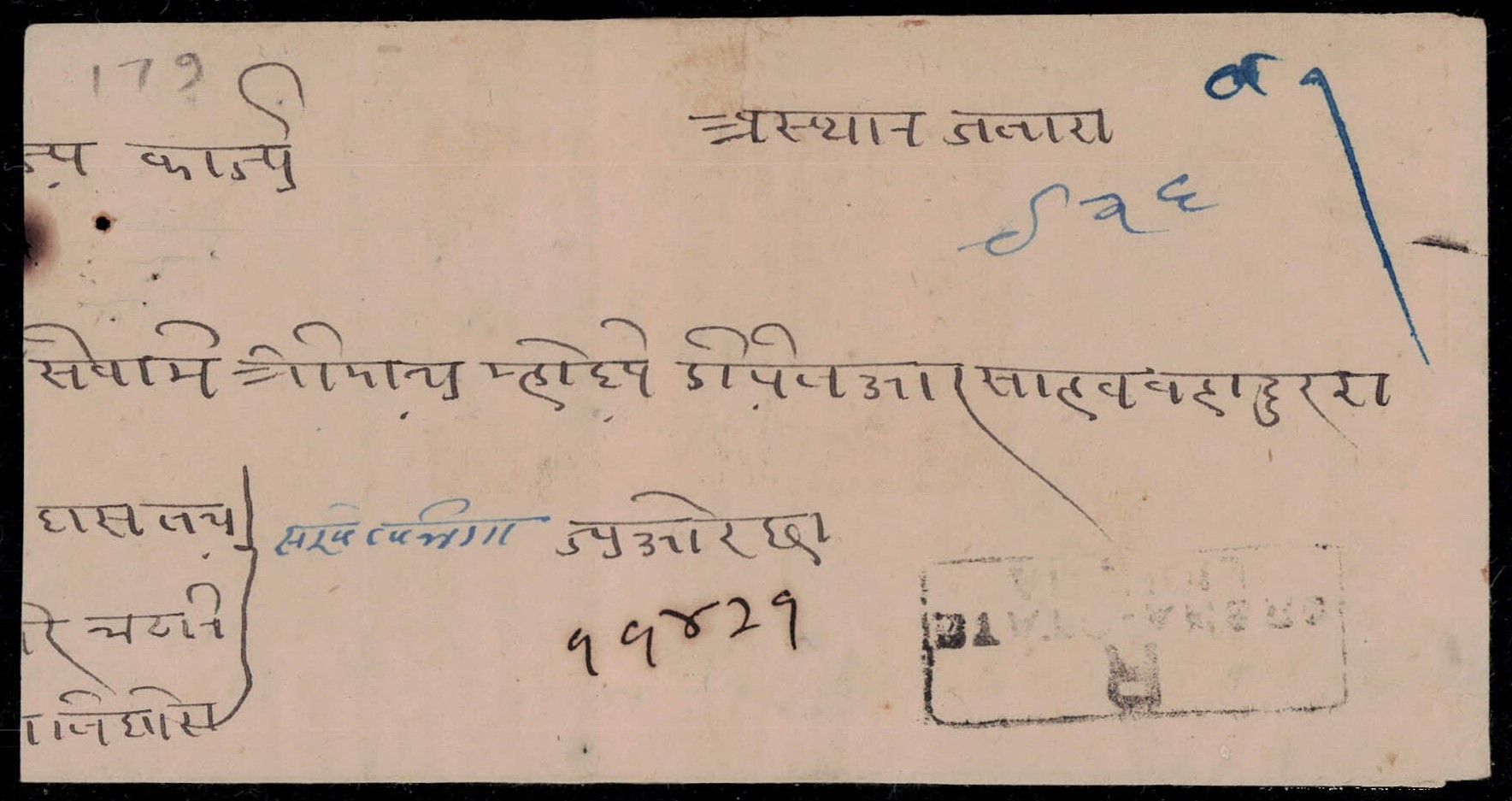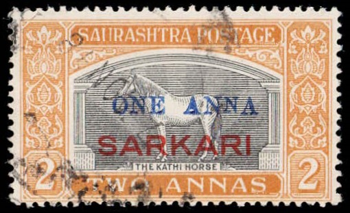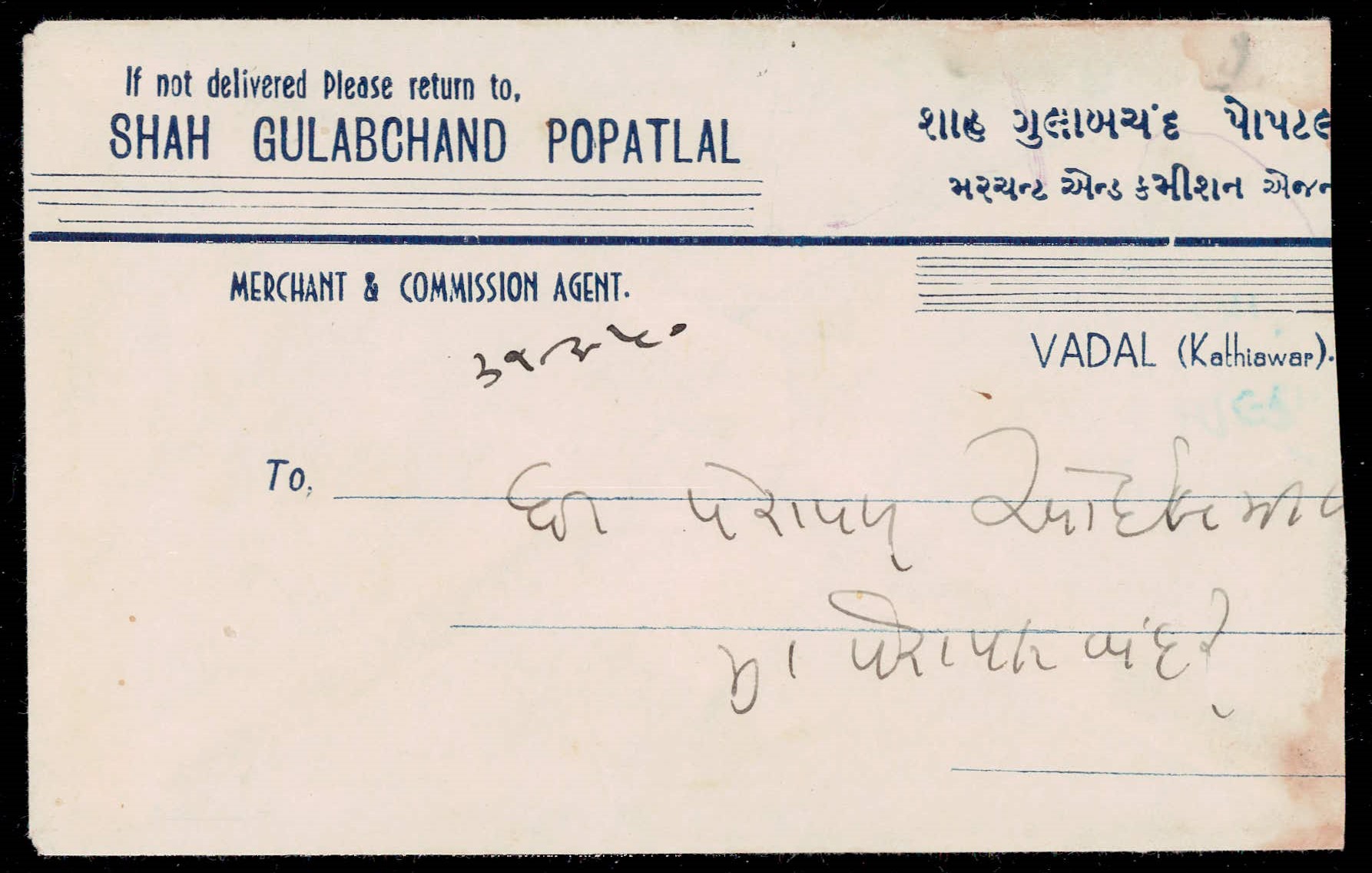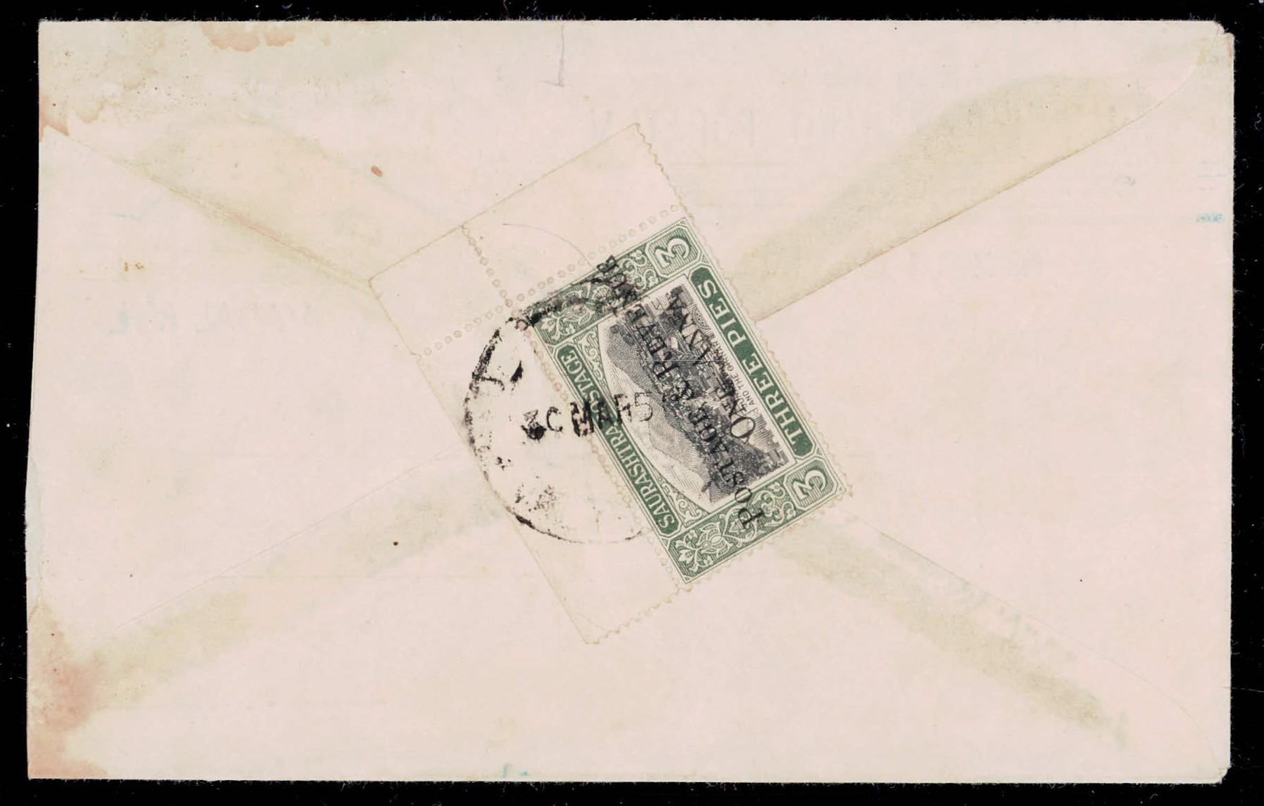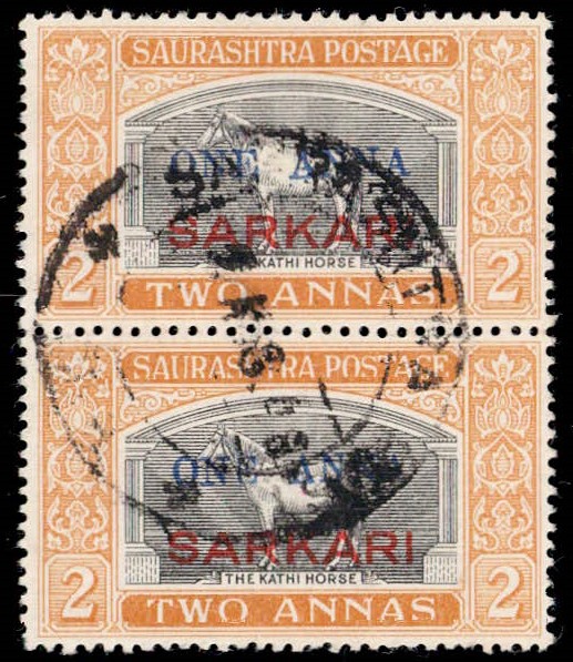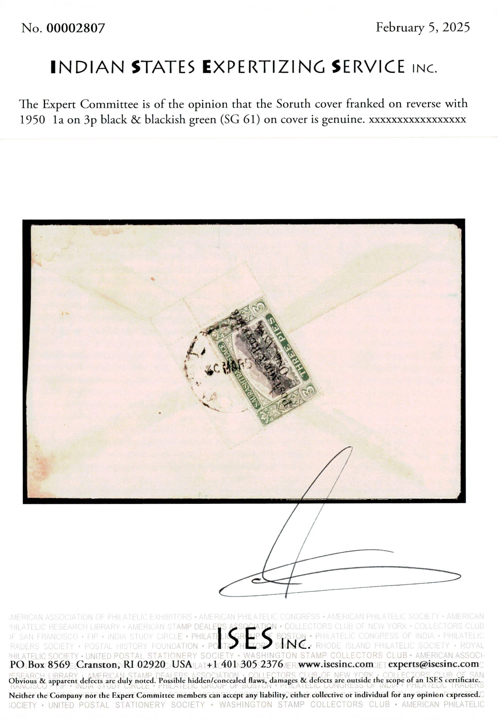 30 March 1950 cover franked on reverse with 1950 3p black & blackish green surcharged 'POSTAGE & REVENUE / ONE ANNA' corner marginal copy tied by 30 March 1950 cds. This is the last day of use as the United States of Saurashtra postal service was incorporated into that of India on 30 March 1950. An important item of Soruth postal history.