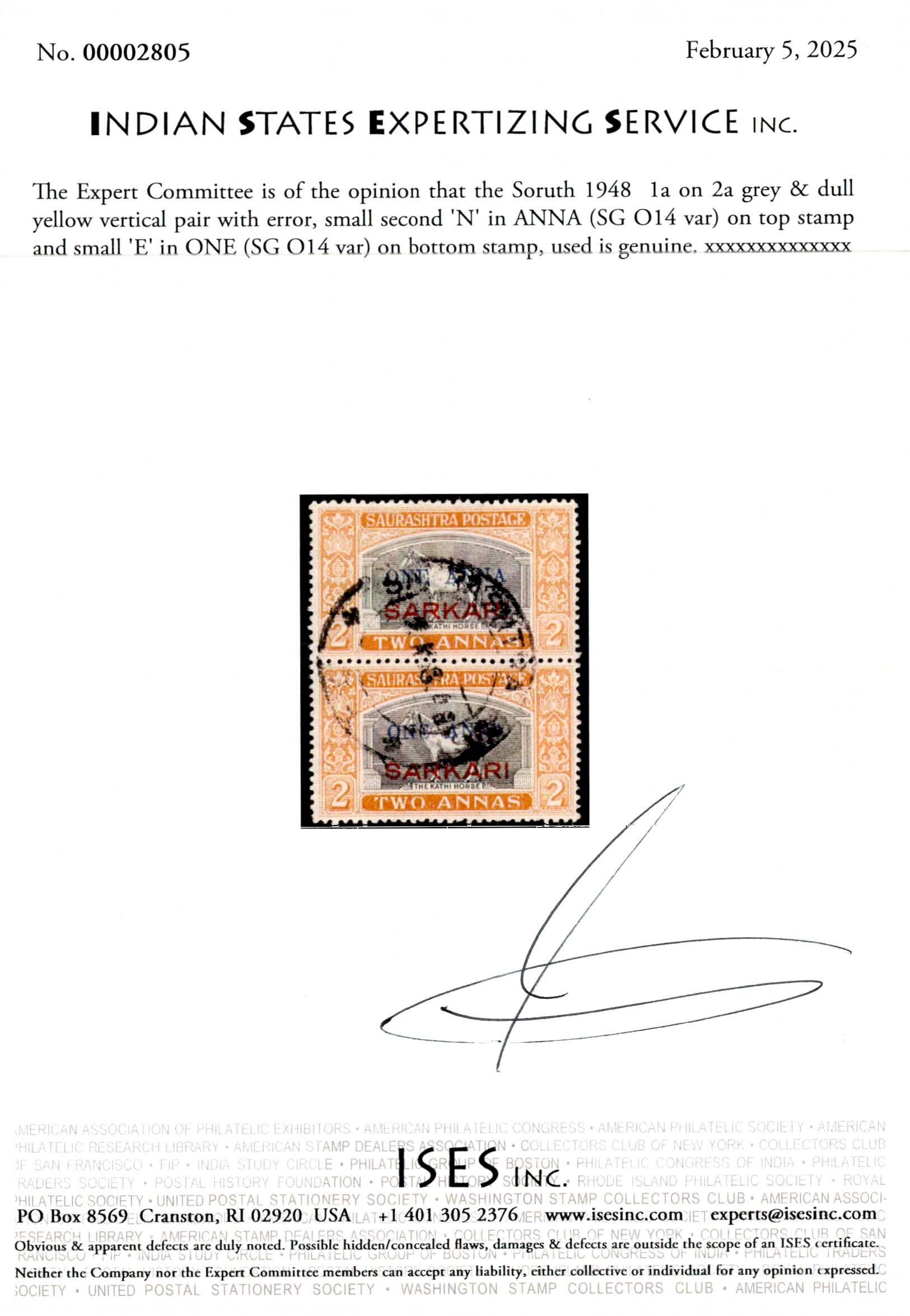 1948 1a on 2a grey & dull yellow vertical pair with error, small second 'N' in ANNA on top stamp and small 'E' in ONE on bottom stamp