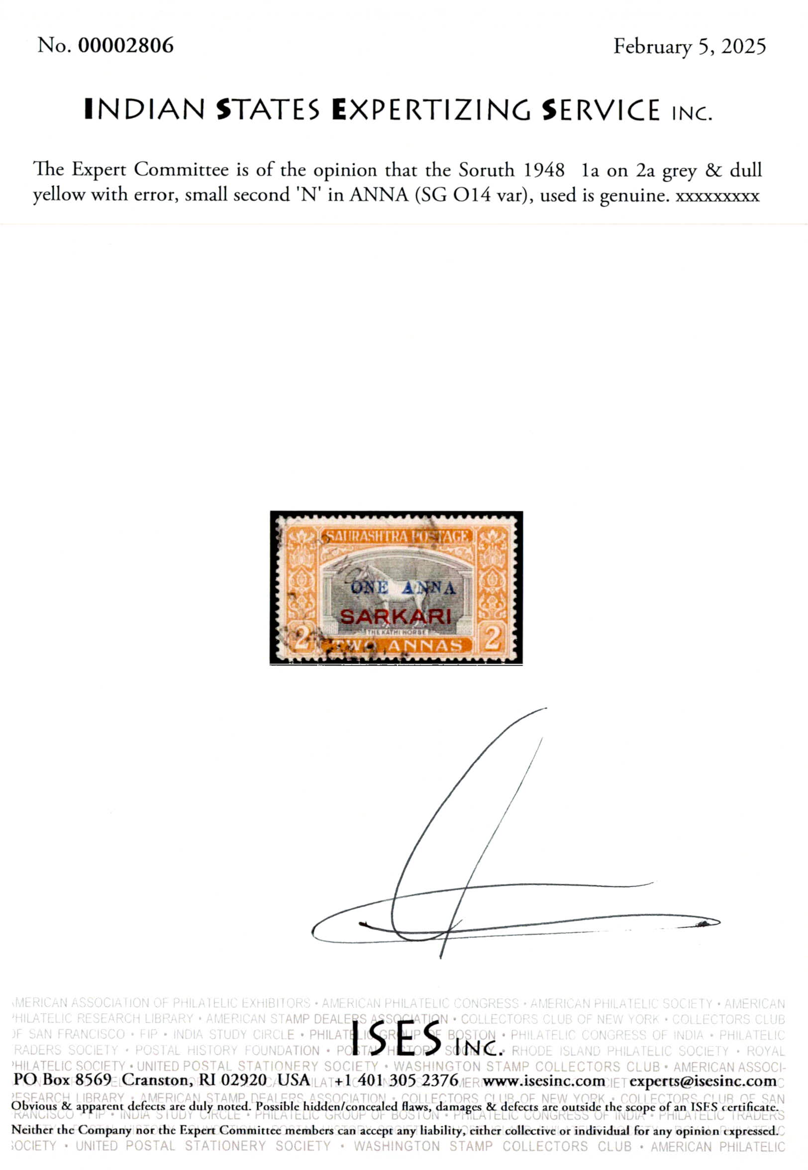 1948 1a on 2a grey & dull yellow with error, small second 'N' in ANNA.