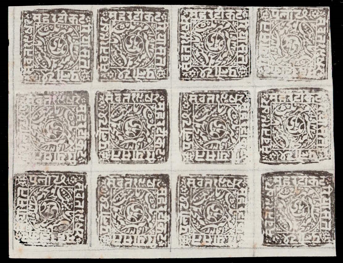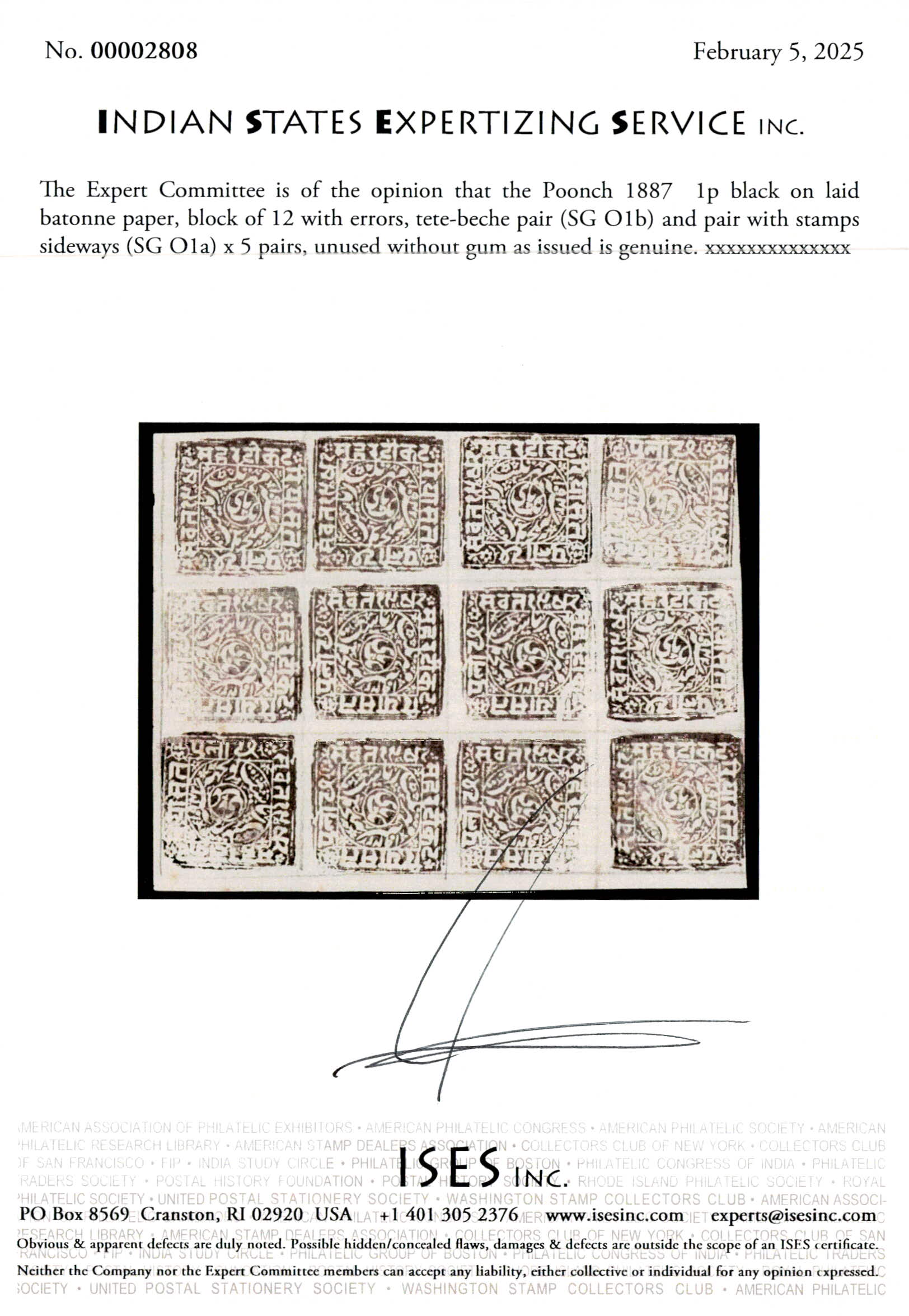 1887 1p black on laid batonne paper, block of 12 with errors, tete-beche pair x1 and pair with stamps sideways x 5 pairs. Unused without gum as issued. 2025 ISES certificate.