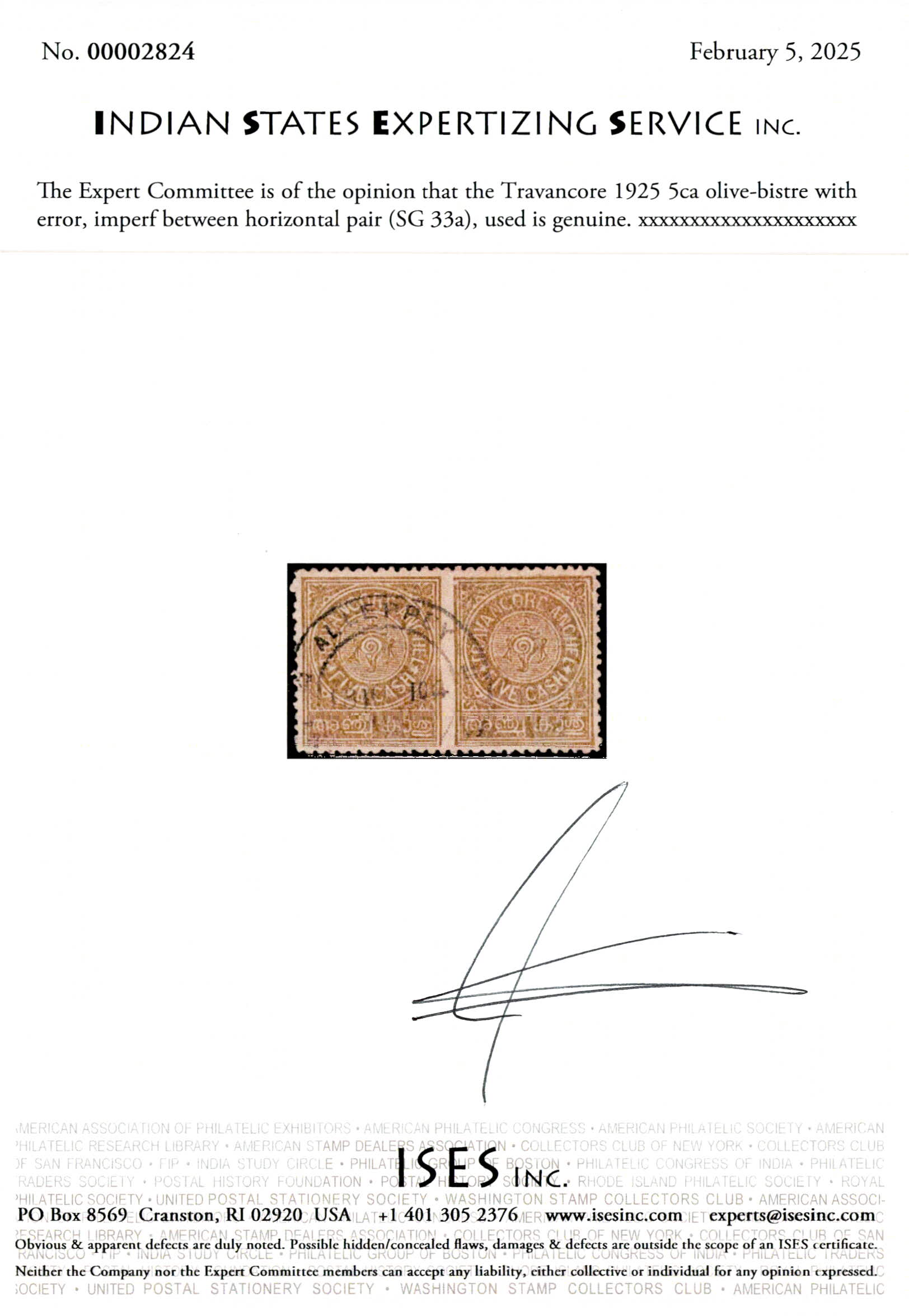1925 5ca olive-bistre with error, imperf between horizontal pair. 2025 ISES certificate.