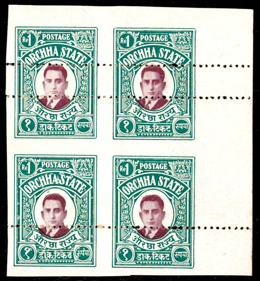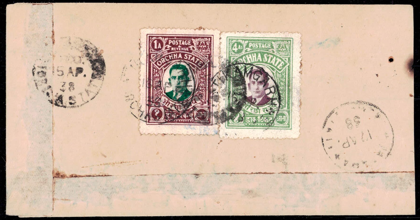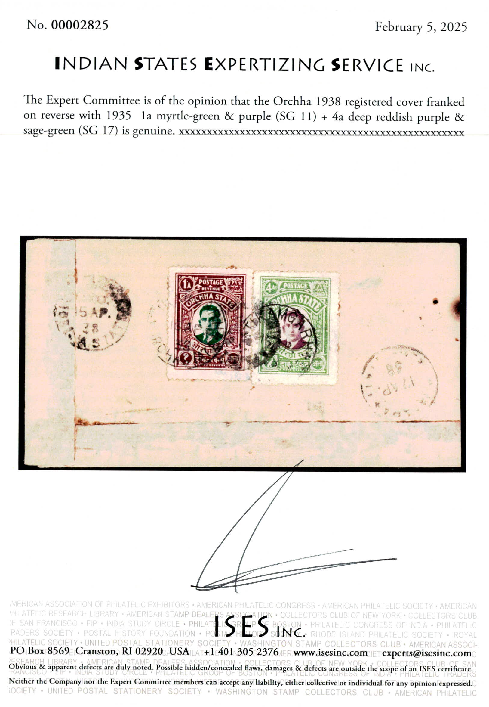 1938 registered cover with boxed registration strike on front franked on reverse with 1935 1a myrtle-green & purple + 4a deep reddish purple & sage-green both tied 'TIKAMGARH / ORCHA STATE / 16 AP 38' cds with 'SATARA / ORCHA STATE / 17 AP 38' delivery cds. Note after SG 30 reads "Owing to the lack of proper State control considerable quantities of these stamps were circulated at below face value and the issue was subsequently withdrawn, supplies being exchanged for the 1939-1942 issue. We are, however, now satisfied that the lower values at least did genuine postal duty until 1939. Used prices are for stamps cancelled to order, postally used examples being worth considerably more." An extremely rare registered cover from this issue. 2025 ISES certificate.