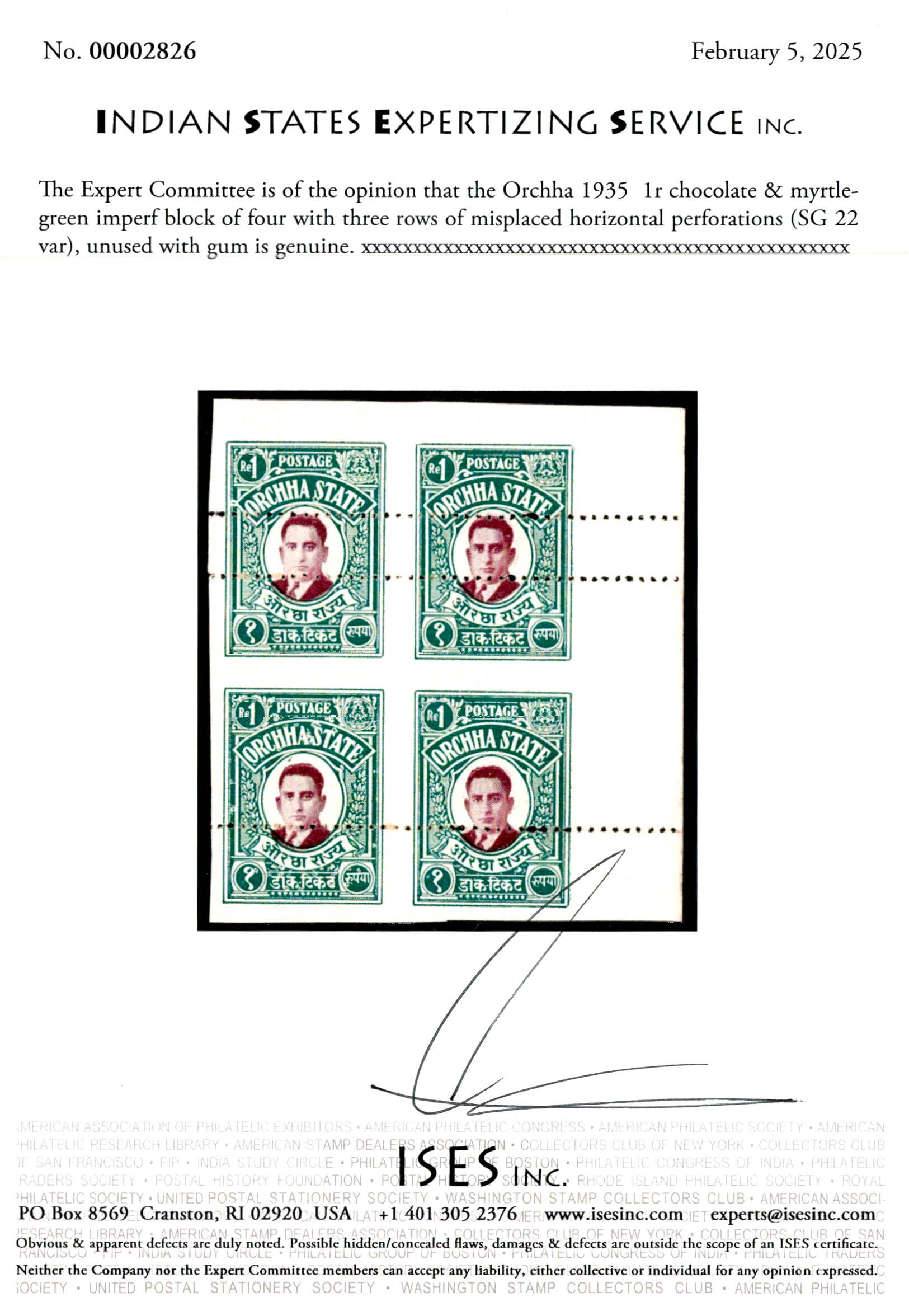 1935 1r chocolate & myrtle-green imperf block of four with three rows of misplaced horizontal perforations. 2025 ISES certificate.