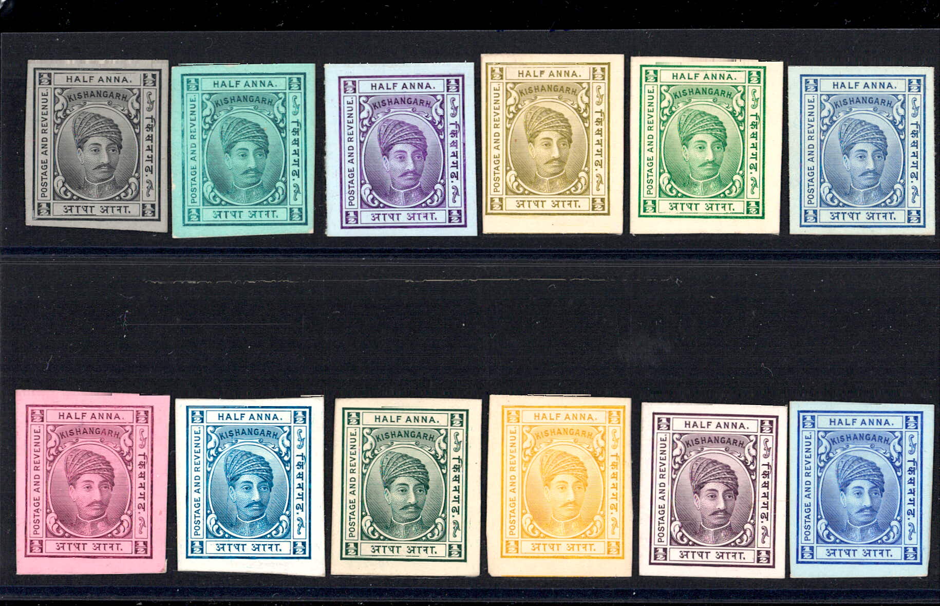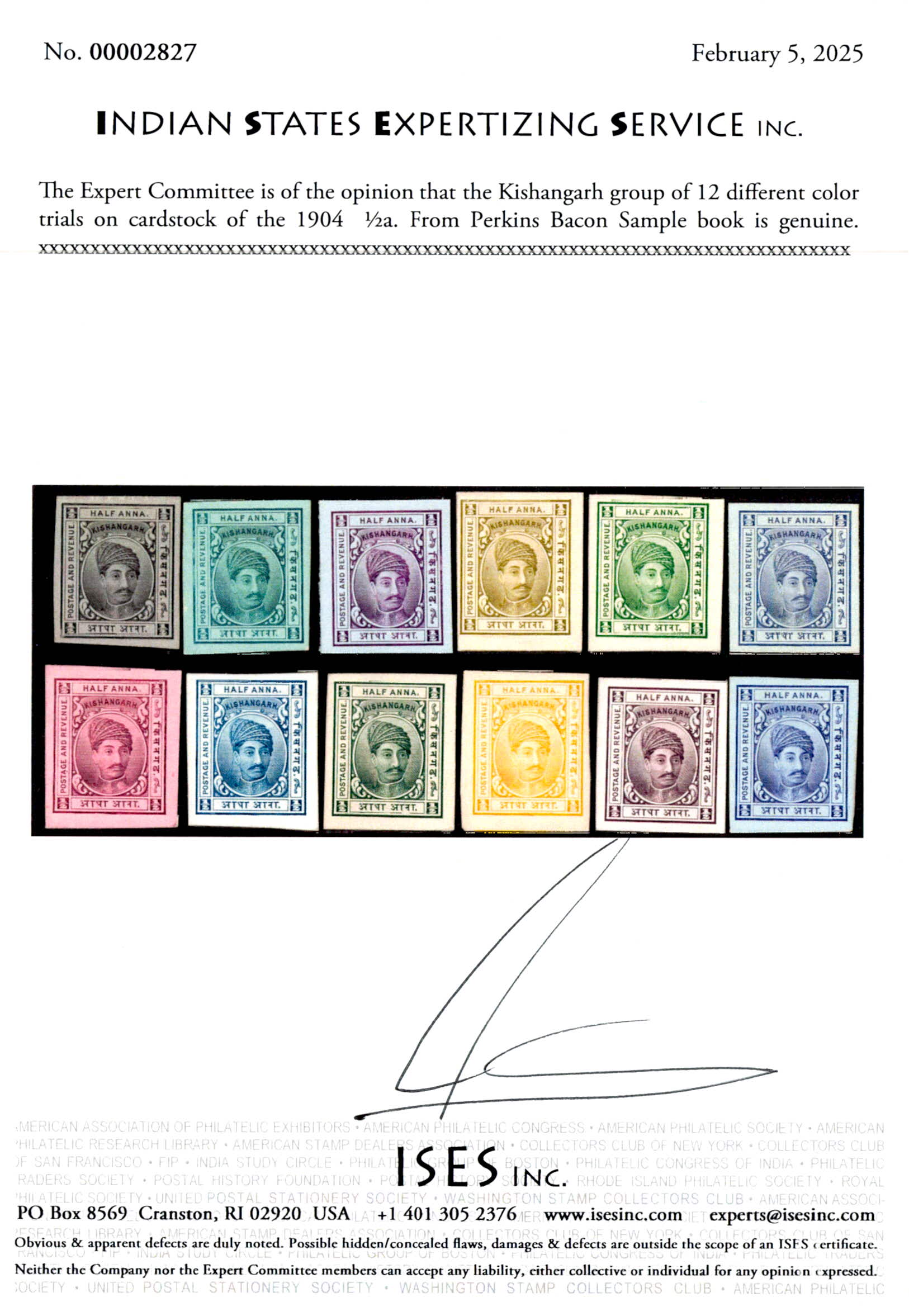 A group of 12 different color trials on cardstock of the 1904 ½a. From Perkins Bacon Sample book. 2025 ISES certificate.