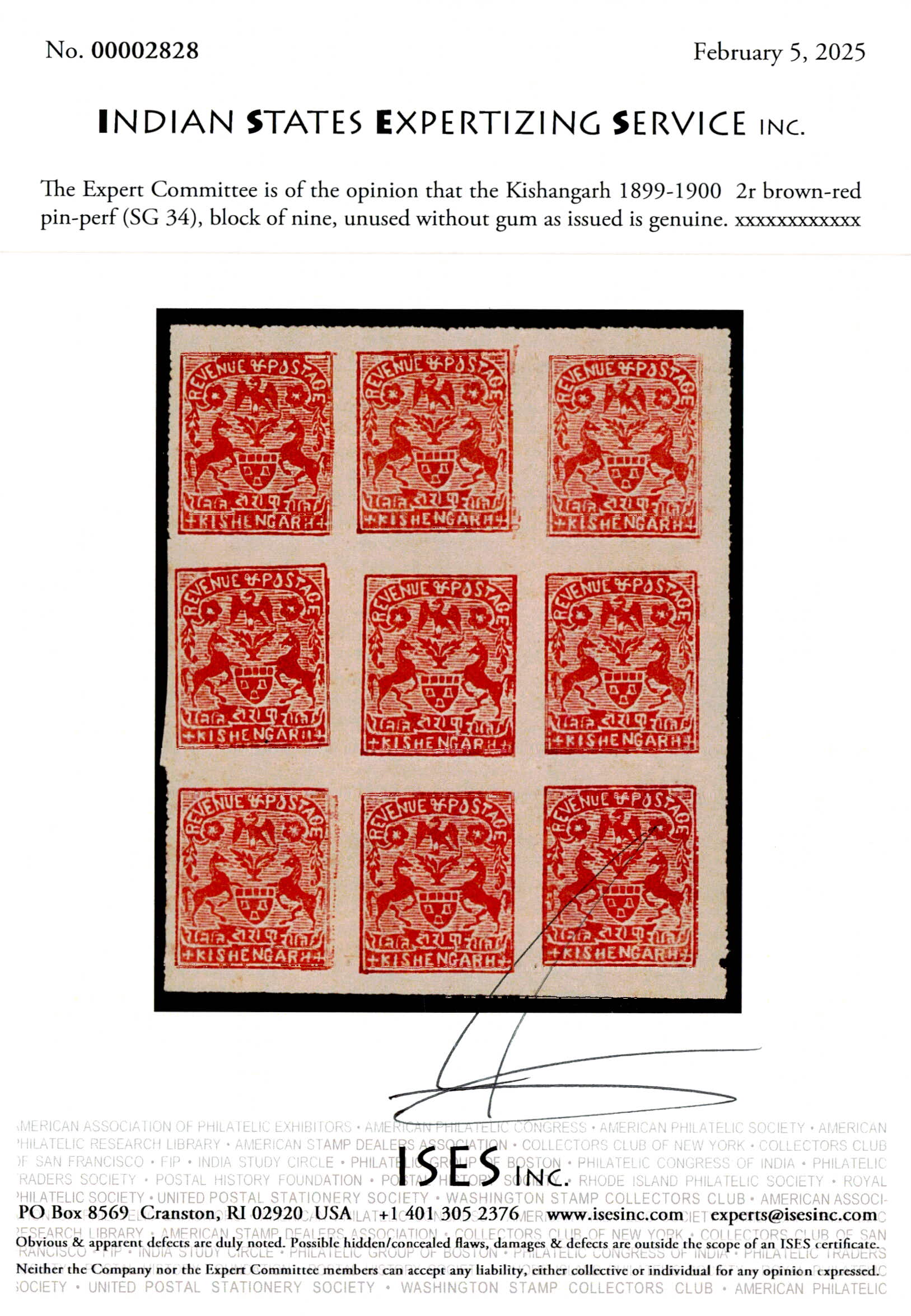 1899-1900 2r brown-red pin-perf, block of nine. Unused without gum as issued. 2025 ISES certificate.