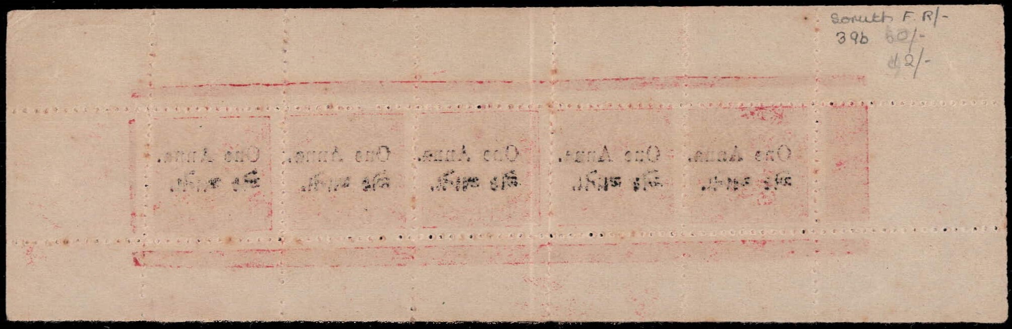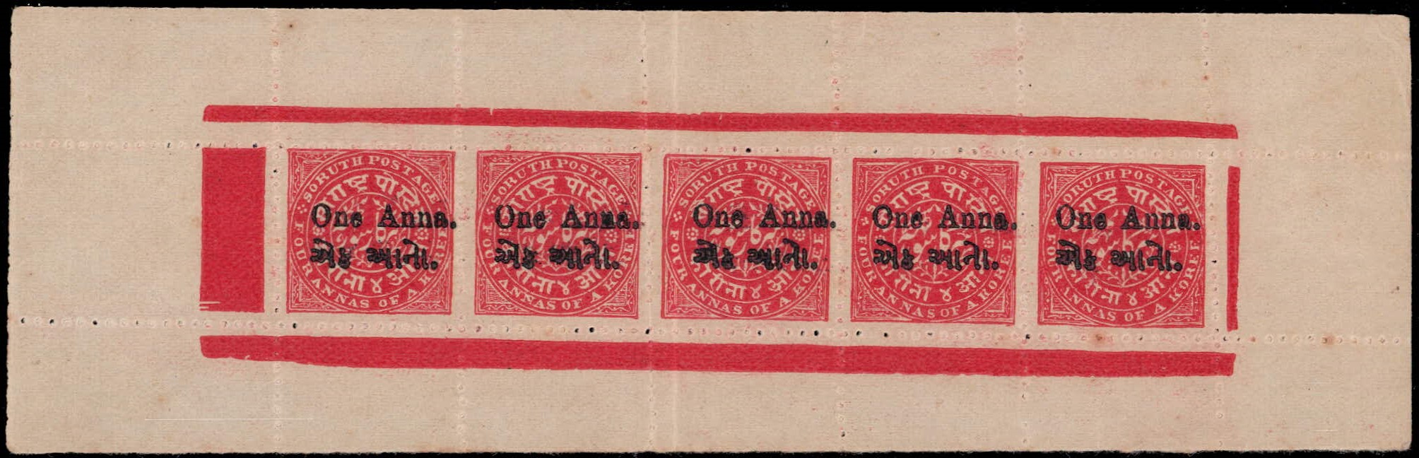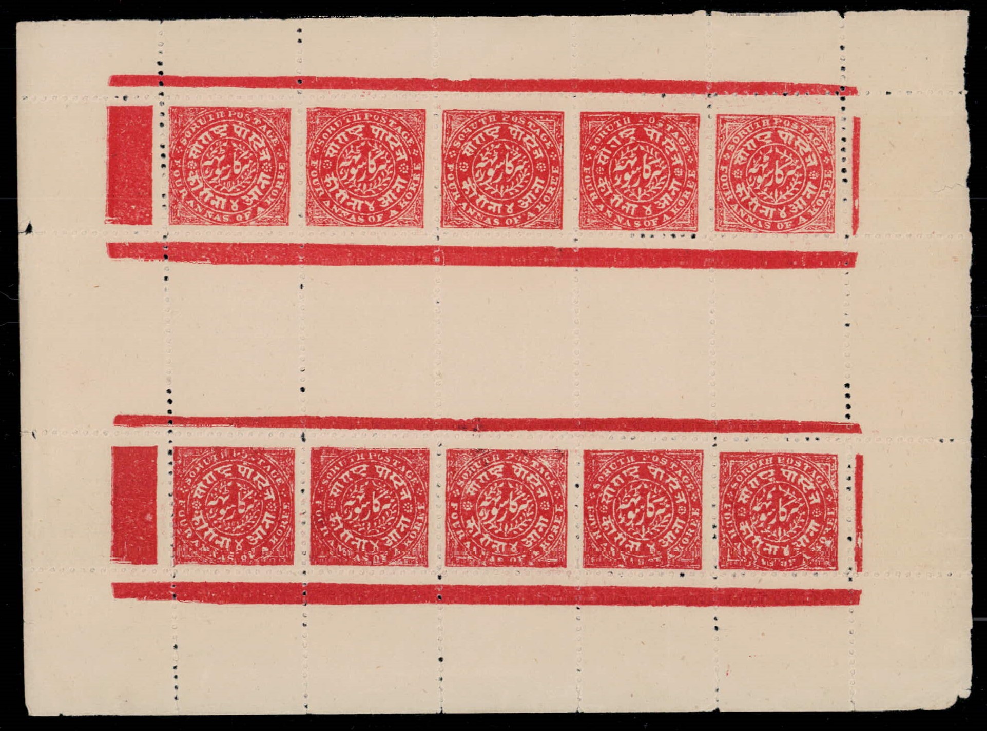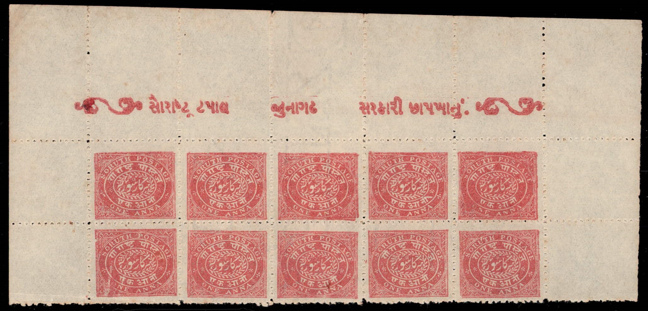 1914 1a rose on wove paper, perf. 12 top marginal part sheet of 10 with top marginal inscription without border. We have not seen this ornamental sheet inscription before. Unused without gum as issued. Catalog value as single stamps £250++. Ex. Dr. E.D. Pereira collection. 2025 ISES certificate.