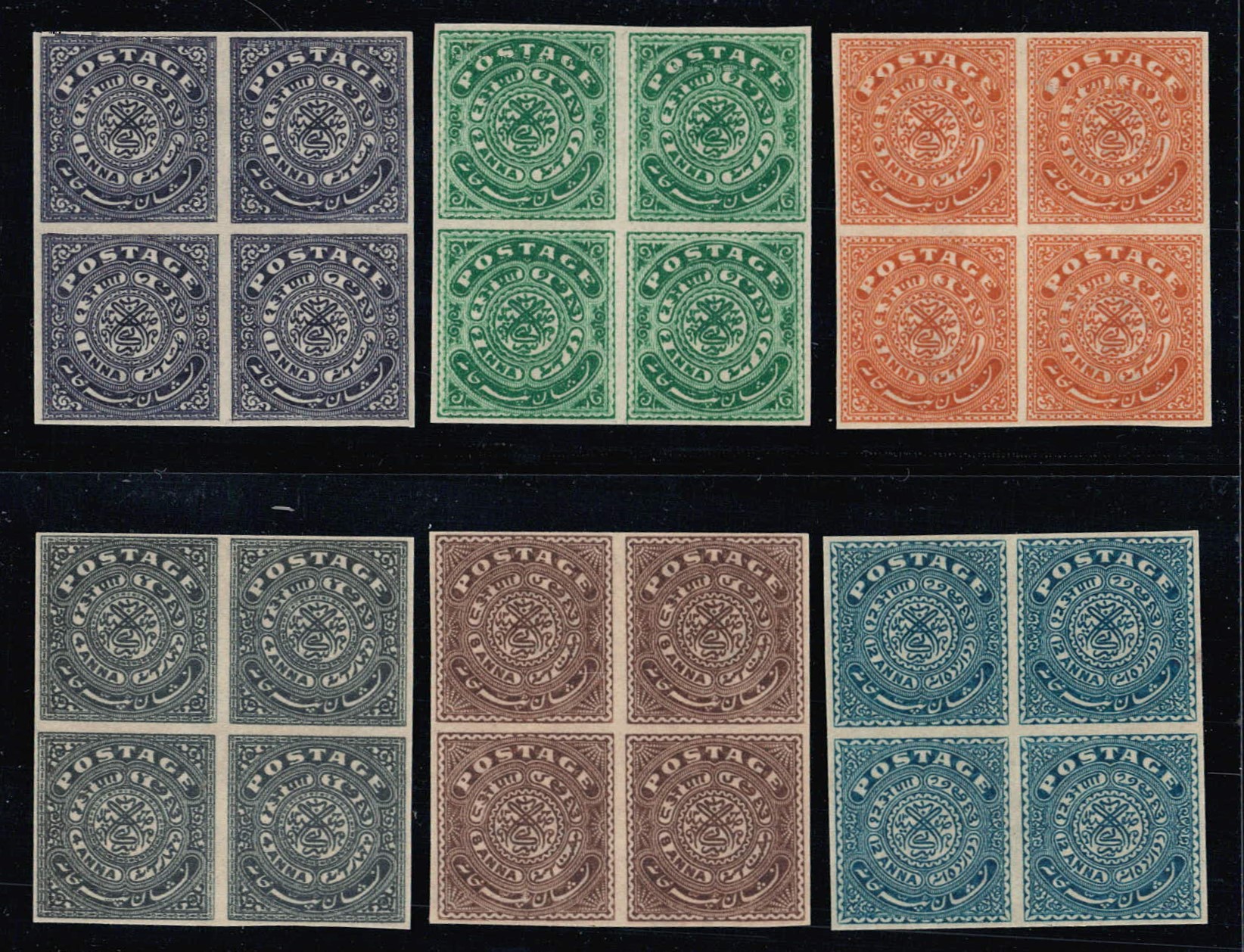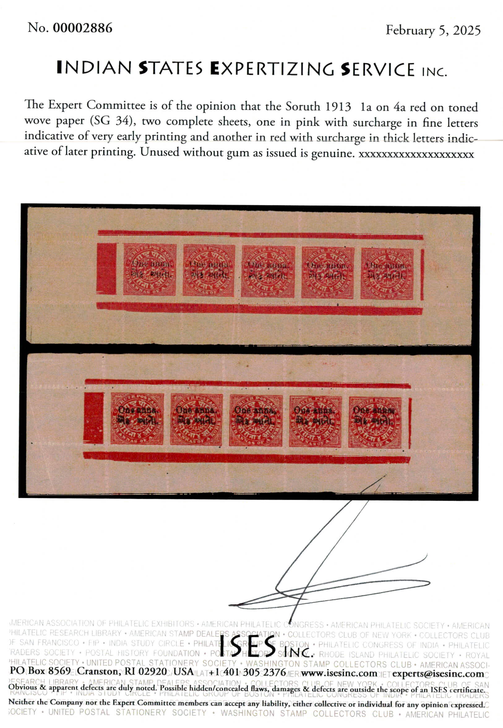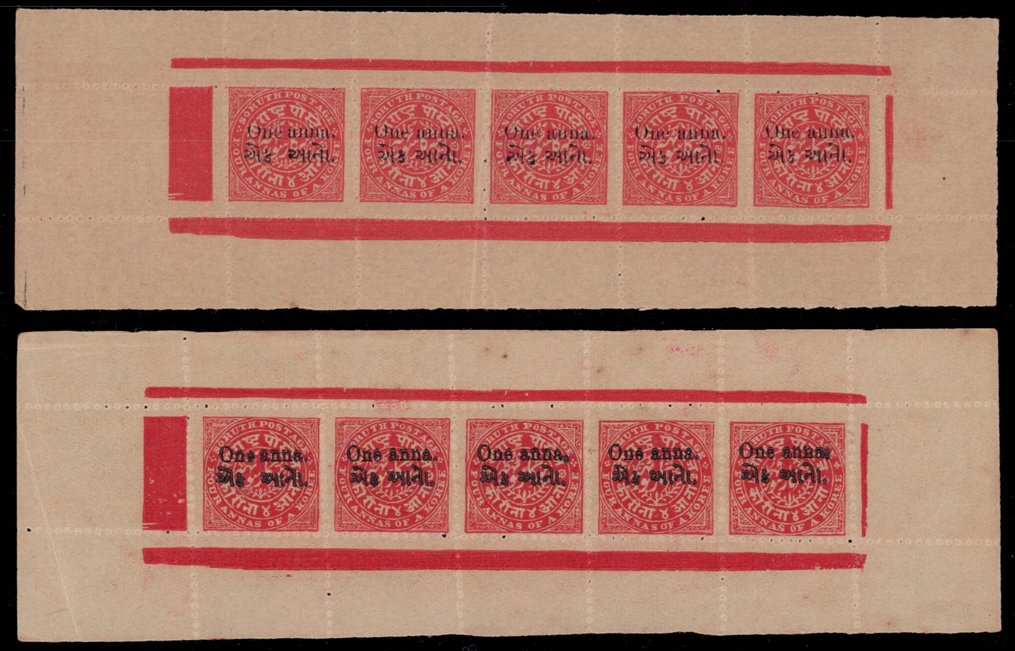 1913 1a on 4a red on toned wove paper two complete sheets, one in pink with surcharge in fine letters indicative of very early printing and another in red with surcharge in thick letters indicative of later printing. Unused without gum as issued. Ex. Dr. E.D. Pereira collection. 2025 ISES certificate.