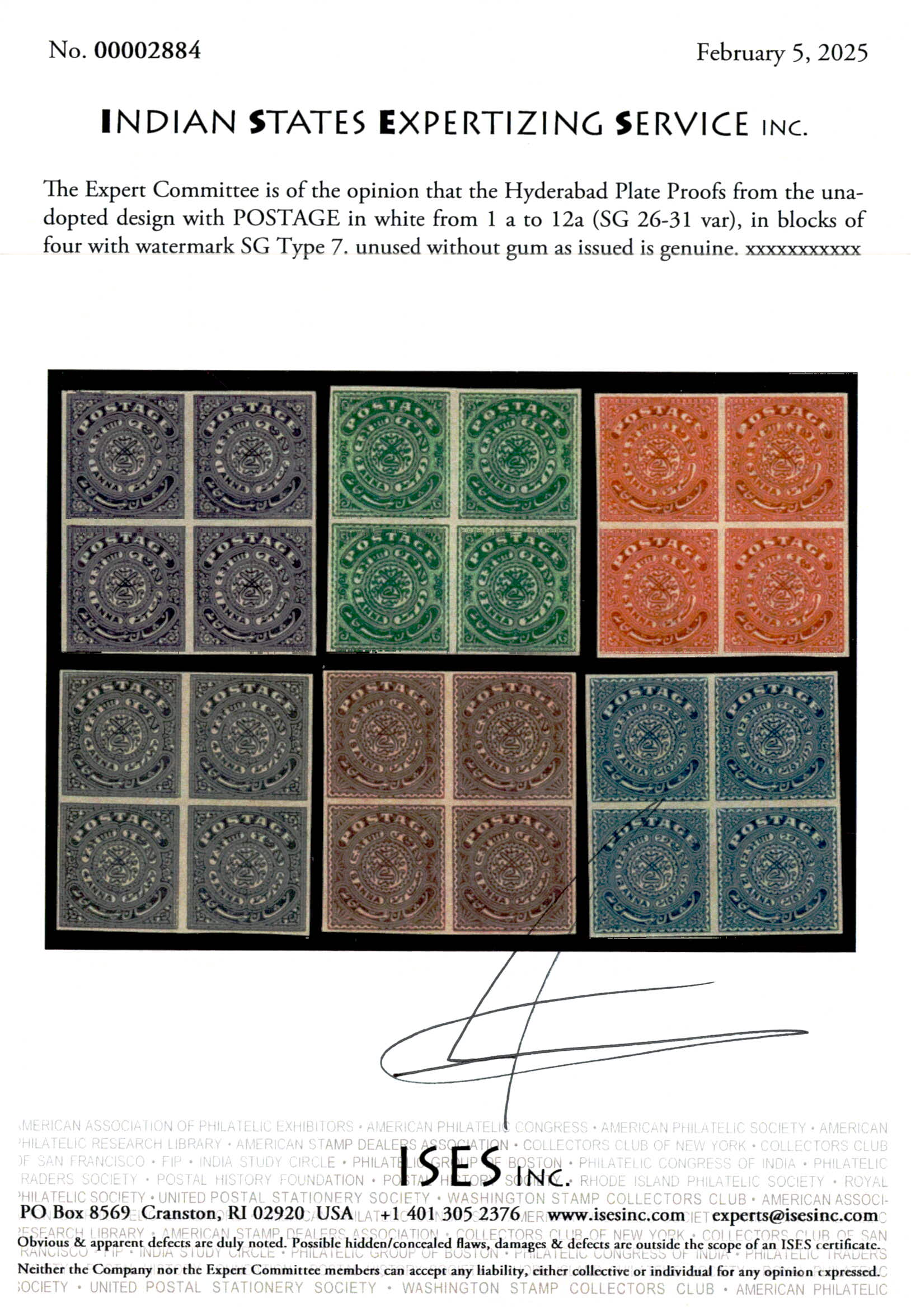 Plate Proofs from the unadopted design with POSTAGE in white from 1 a to 12a in blocks of four with watermark SG Type 7. Unused without gum as issued. 2025 ISES certificate.