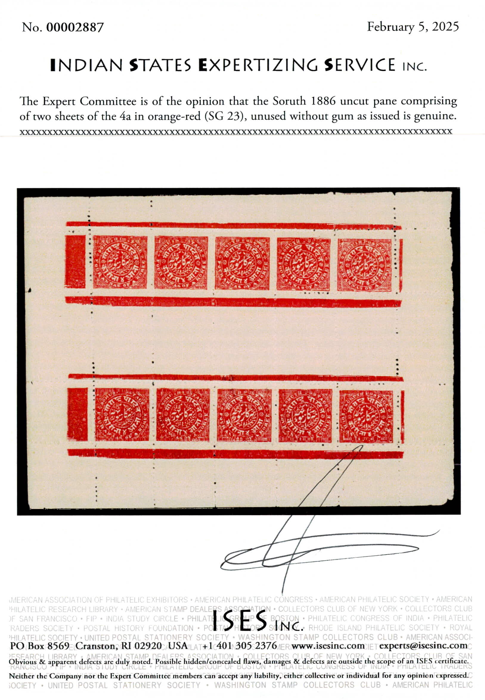 1886 Uncut pane comprising of two sheets of the 4a in orange-red. Most sheets were cut down into single sheets; as such, rare in this format. Unused without gum as issued. Ex. Dr. E.D. Pereira collection. 2025 ISES certificate.