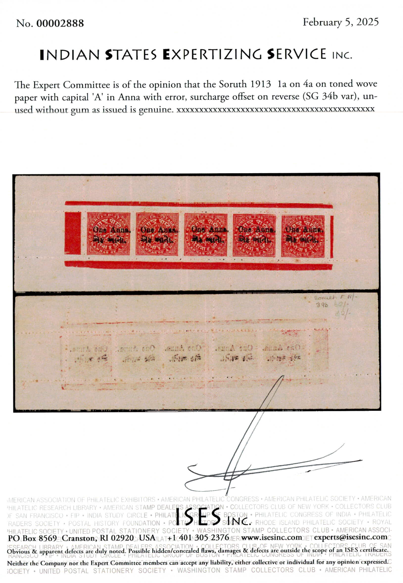 1913 1a on 4a on toned wove paper with capital 'A' in Anna with error, surcharge offset on reverse. Unused without gum as issued. Ex. Dr. E.D. Pereira collection. 2025 ISES certificate.