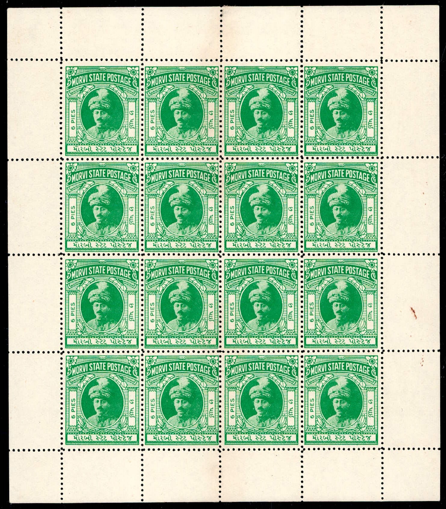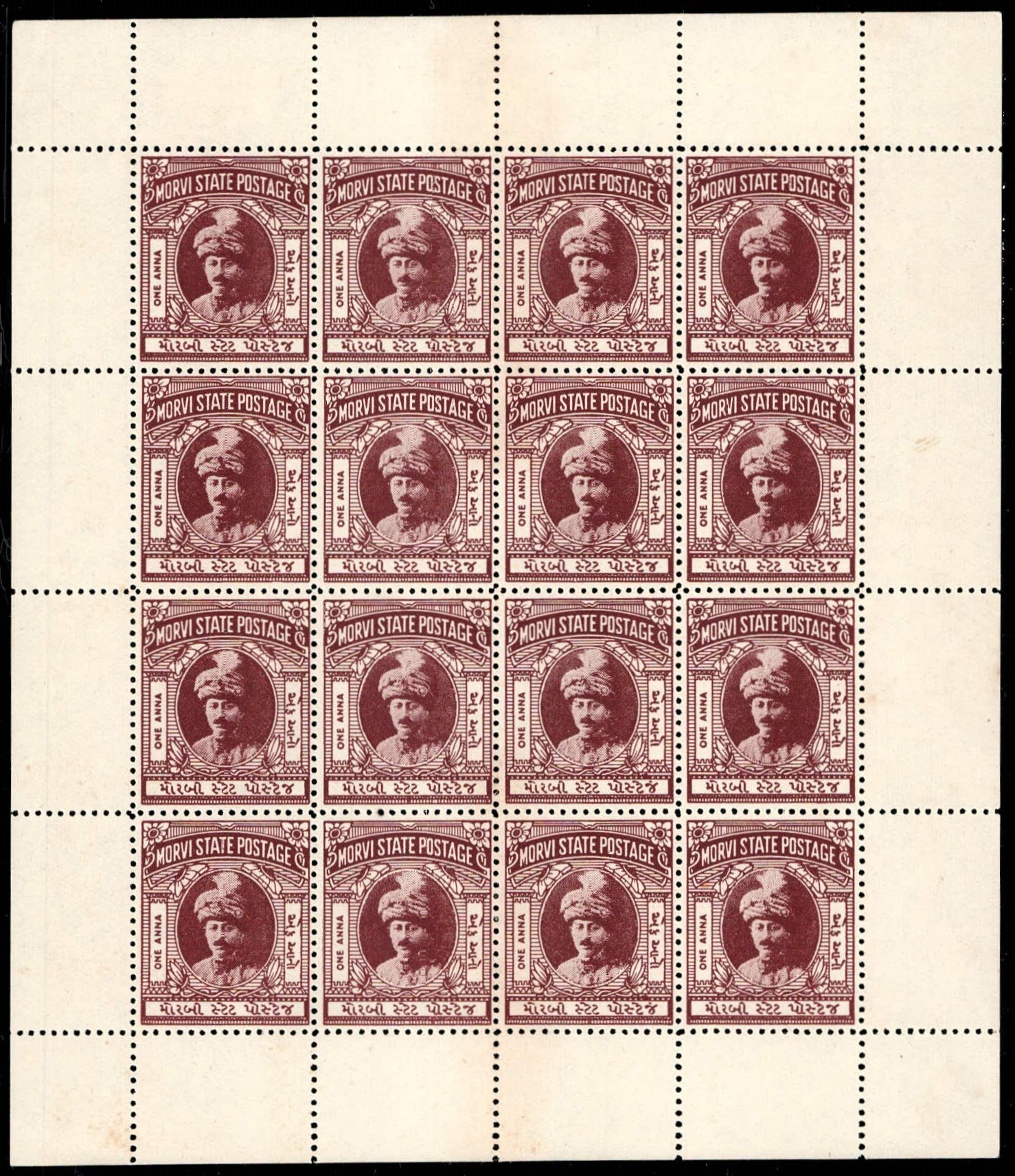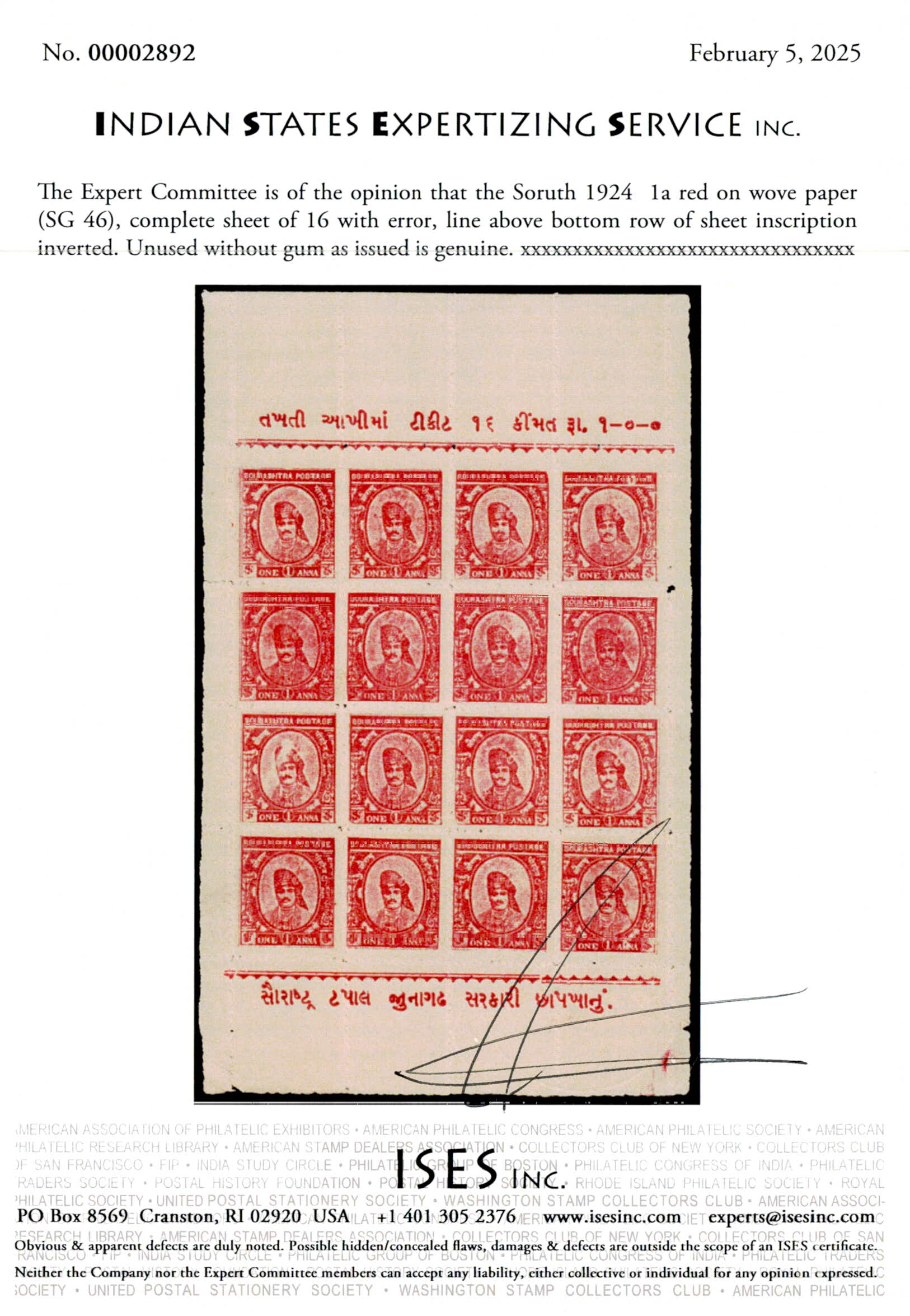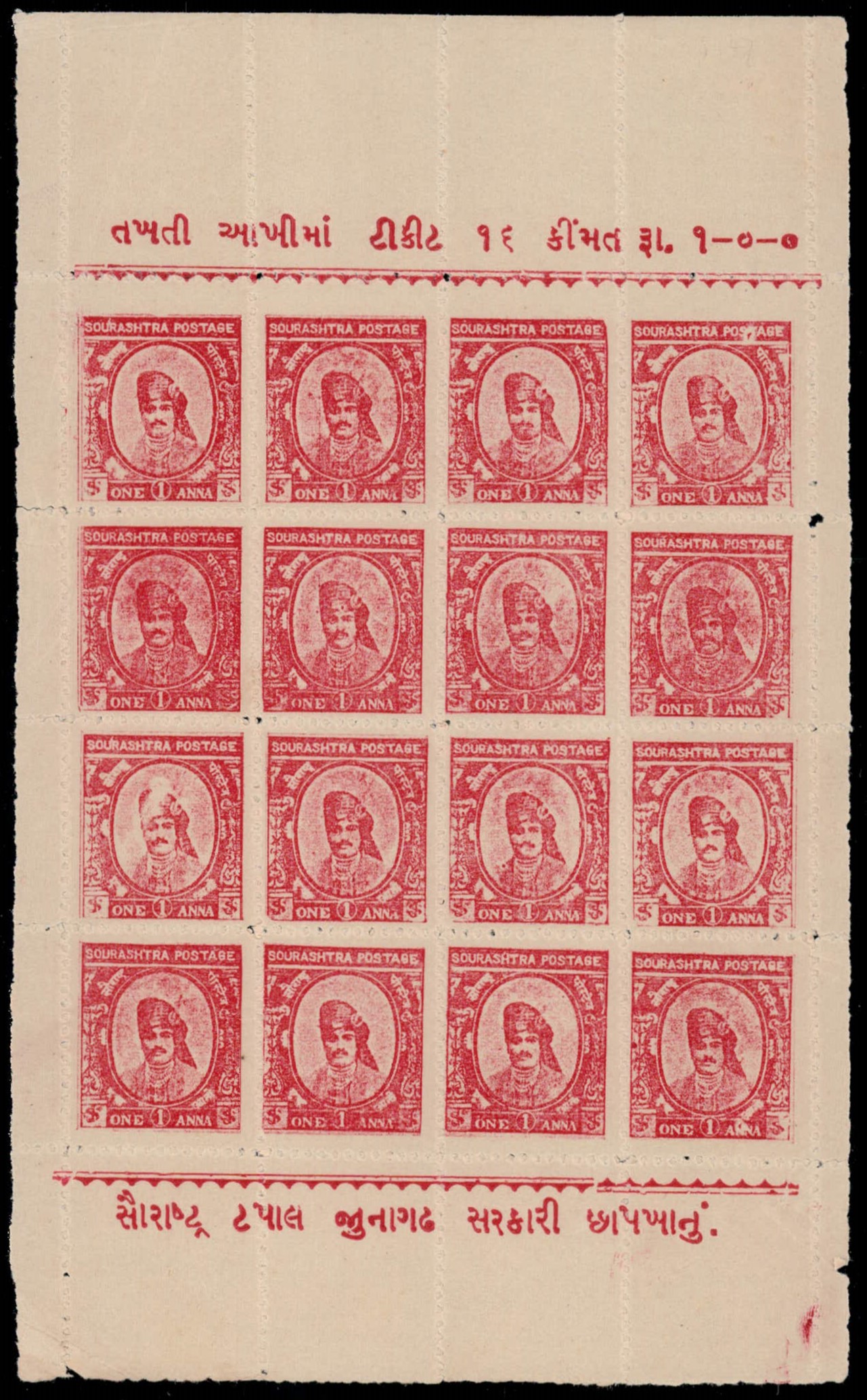 1924 1a red on wove paper, complete sheet of 16 with error, line above bottom row of sheet inscription inverted. Unused without gum as issued. Ex. Dr. E.D. Pereira collection. 2025 ISES certificate.