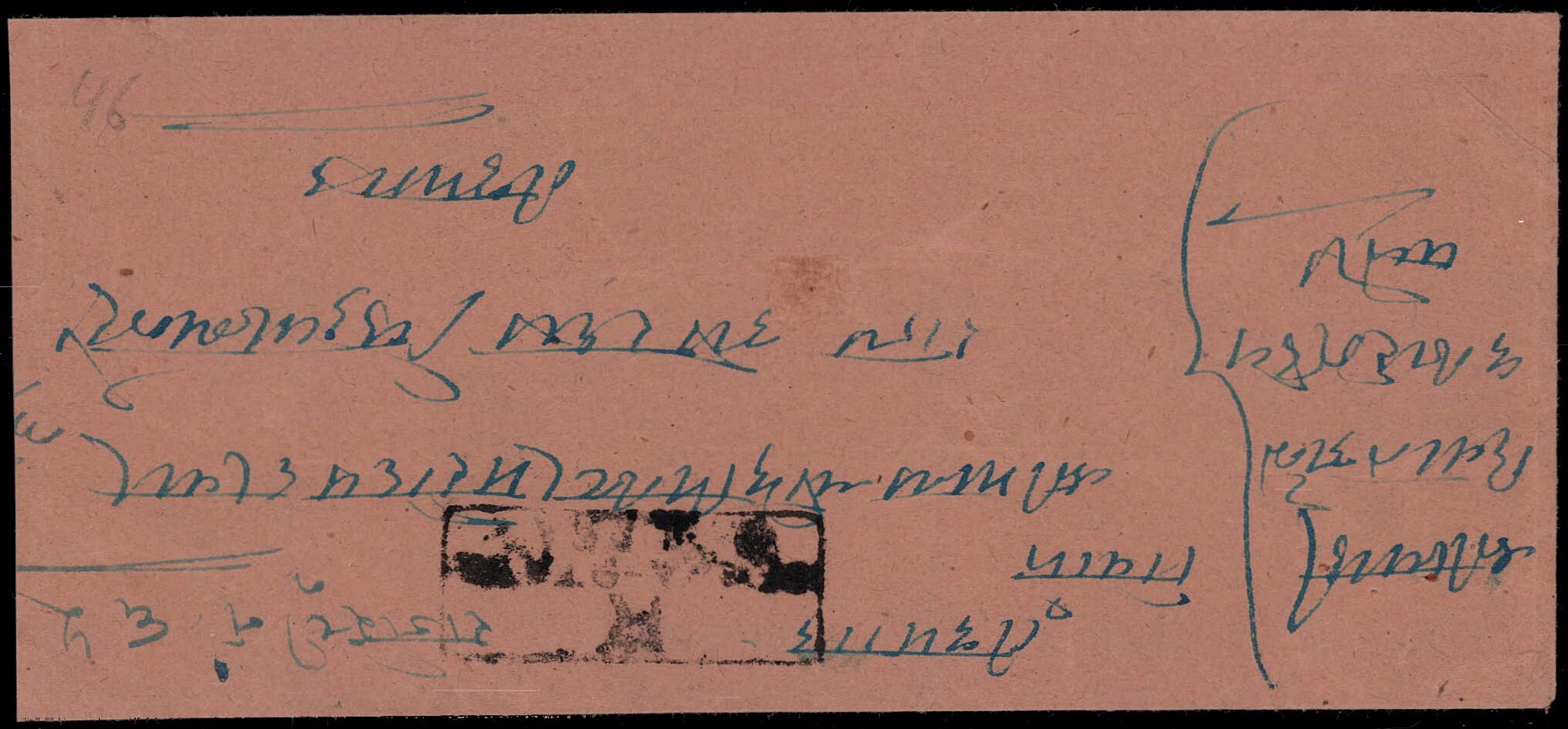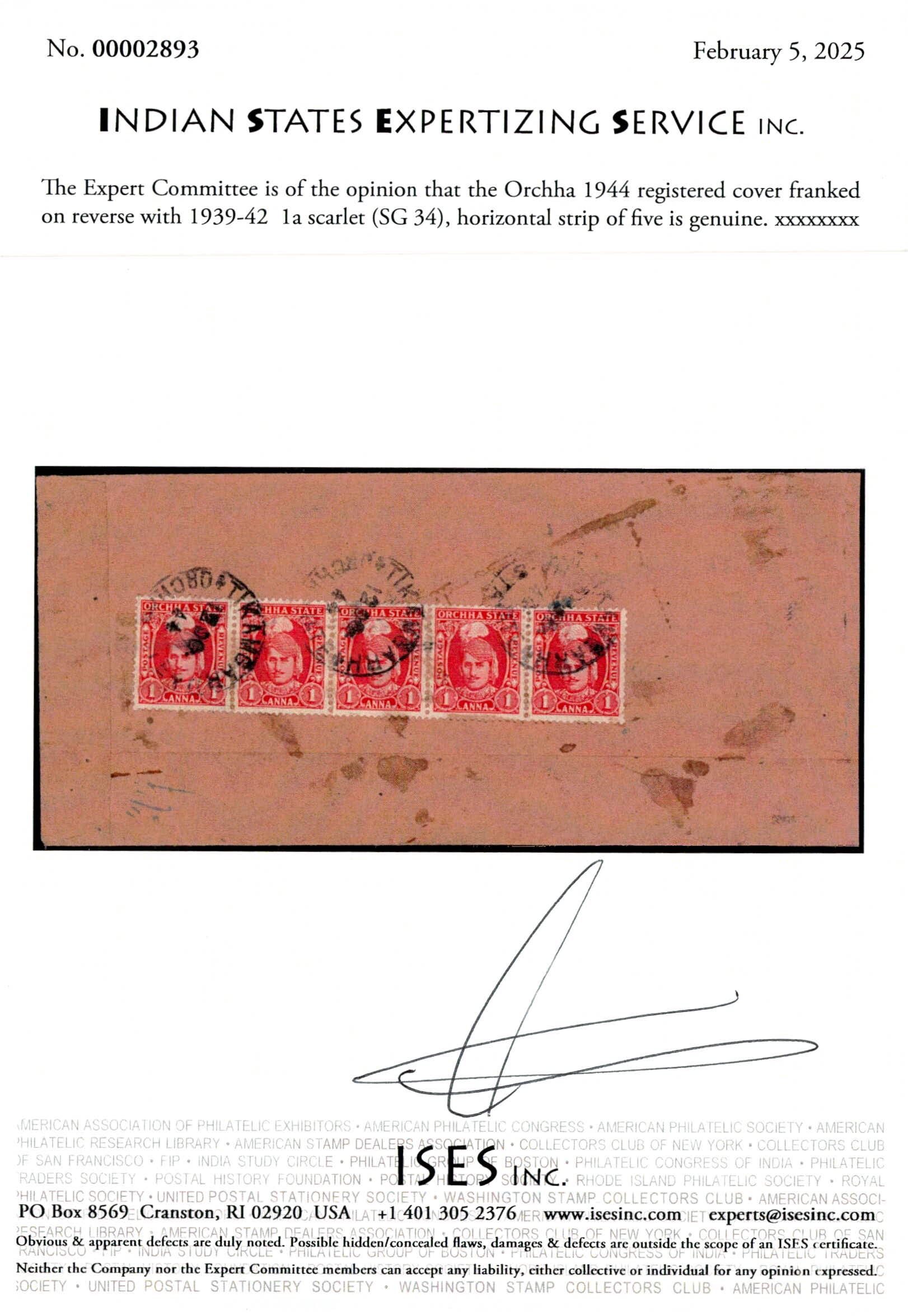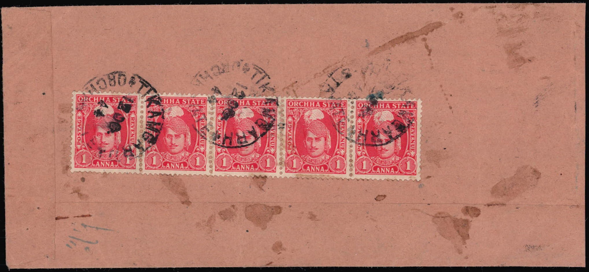 1944 registered cover with boxed registration strike on obverse franked on reverse with 1939-42 1a scarlet horizontal strip of five all tied by 'TIKAMGARH / ORCHA STATE / 12 OC 44' cds