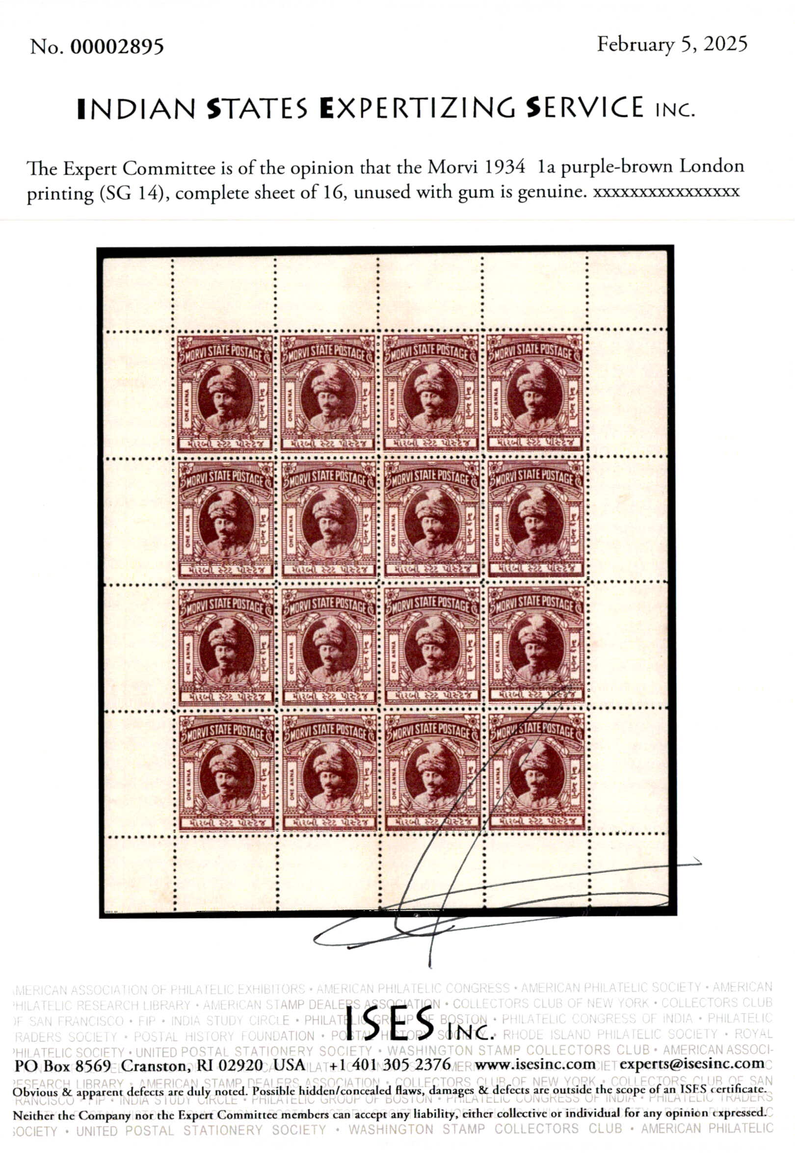 1934 1a purple-brown London printing, complete sheet of 16. Tiny stain spot on margin not affecting stamp. 2025 ISES certificate.