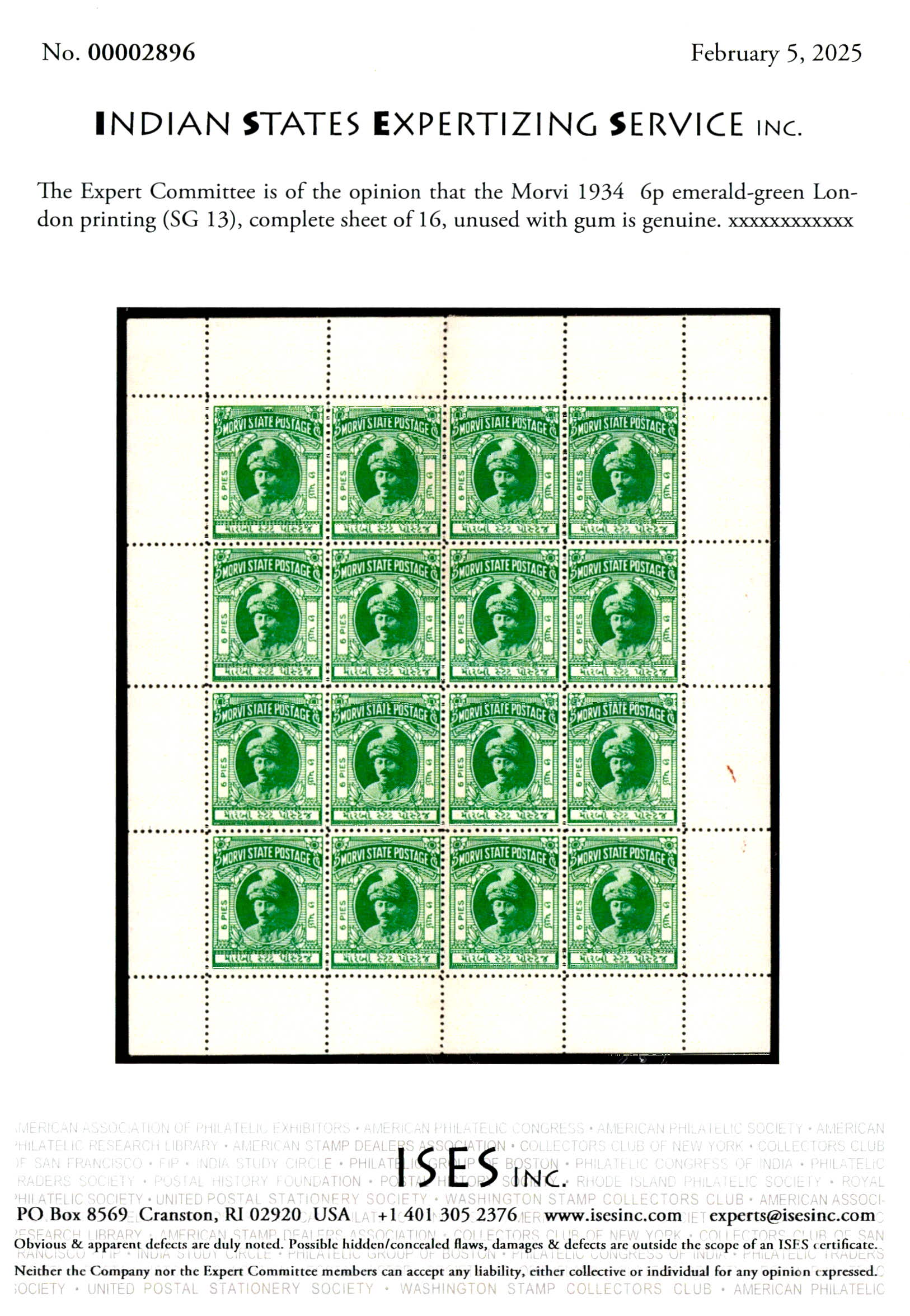 1934 6p emerald-green London printing, complete sheet of 16. 2025 ISES certificate.