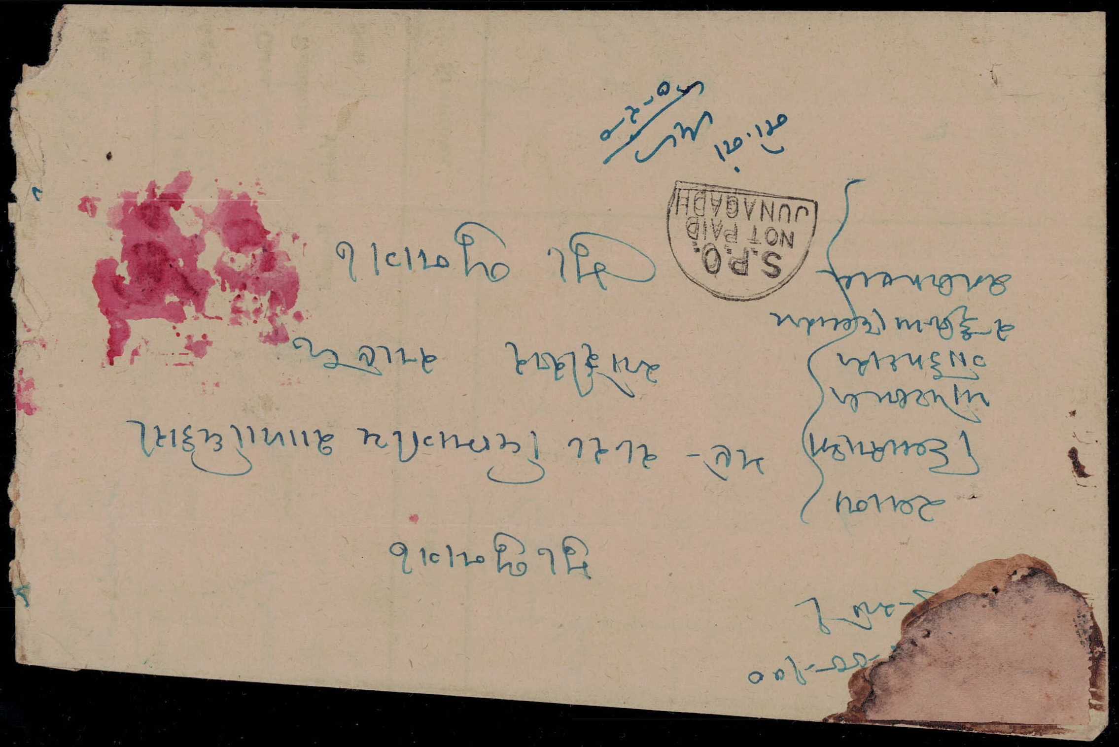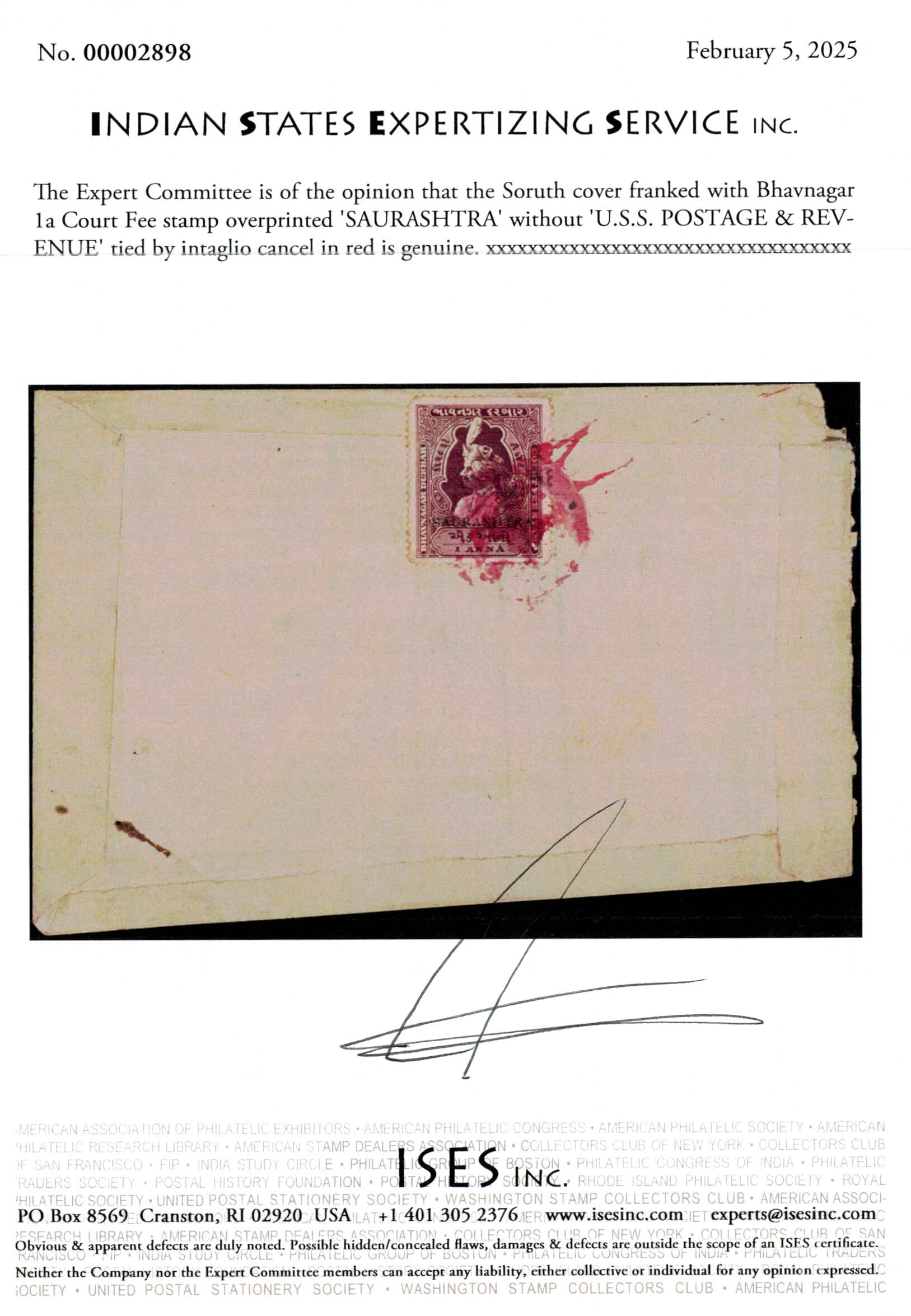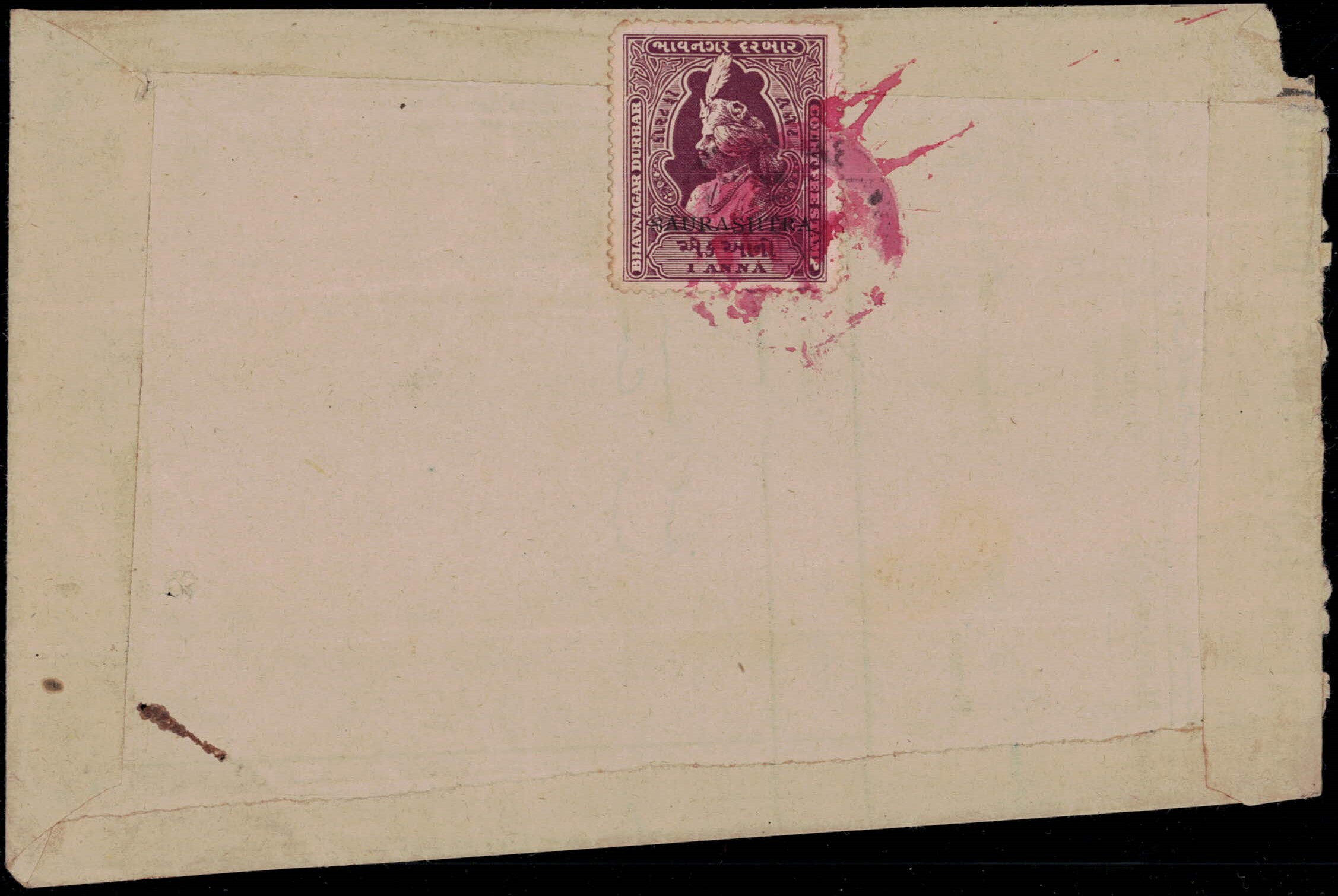 Bhavnagar 1a Court Fee stamp overprinted 'SAURASHTRA' without 'U.S.S. POSTAGE & REVENUE' used on cover tied by intaglio cancel in red with horseshoe 'S.P.O. / NOT PAID / JUNAGADH' strike with manuscript '0-2-0' to indicate that postage due of 2 annas was to be collected from the addressee. This cover was an attempt by the sender to use a revenue stamp to prepay postage charges. This was not allowed and the letter was charged postage due calculated at twice the deficiency of 1 anna. A spectacular cover. Ex. Dr. E.D. Pereira collection. 2025 ISES certificate.