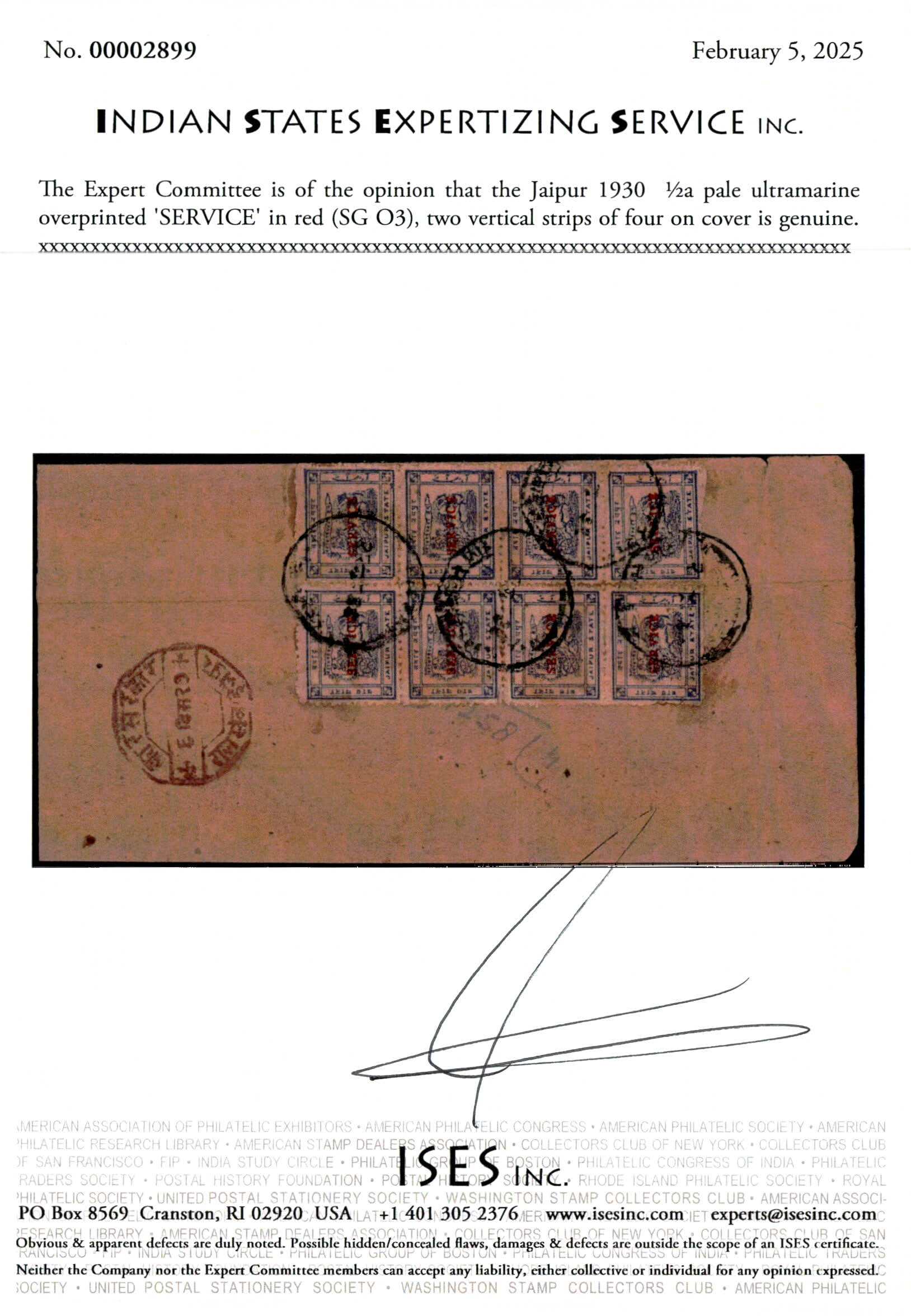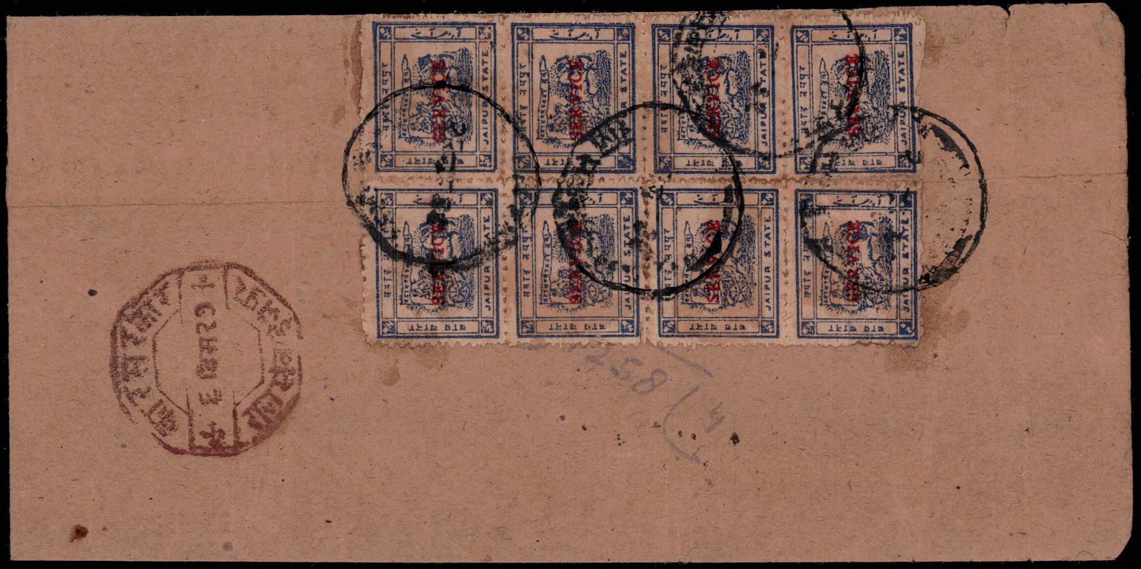 1930 ½a pale ultramarine overprinted 'SERVICE' in red two vertical strips of four on local cover with a superb strike of the rare octagon Kar Sarkar / Raj Sawai Jaipur dated 6 Dec 29 in red. Note that this cover is dated well before the issue date of 23.2.30 listed in Stanley Gibbons catalog. 2025 ISES certificate.