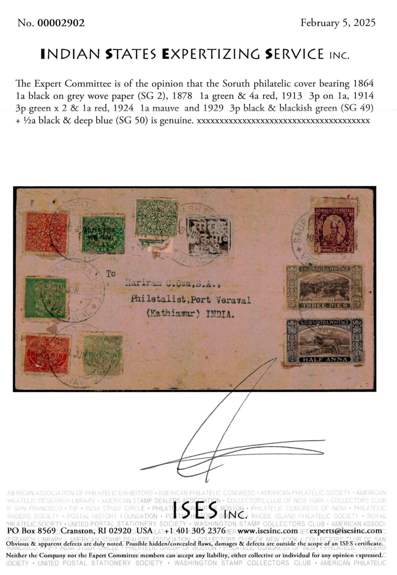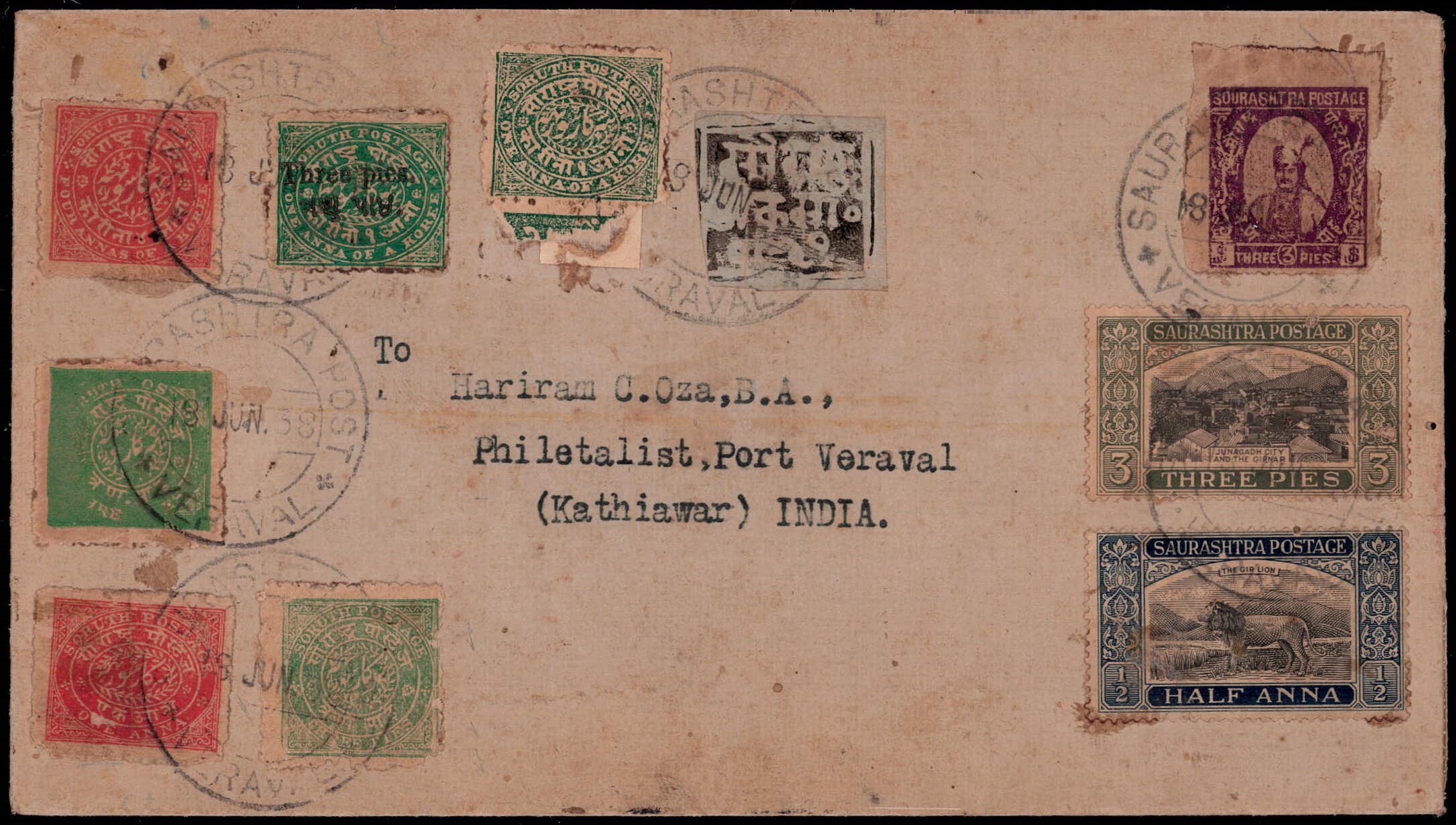Philatelic cover bearing 1864 1a black on grey wove paper (SG 2), 1878 1a green & 4a red, 1913 3p on 1a, 1914 3p green x 2 & 1a red, 1924 1a mauve and 1929 3p black & blackish green + ½a black & deep blue all tied by 'SAURASHTRA POST / VERIVAL / 18 JUN 38' cds. Ex. Dr. E.D. Pereira collection.2025 ISES certificate.