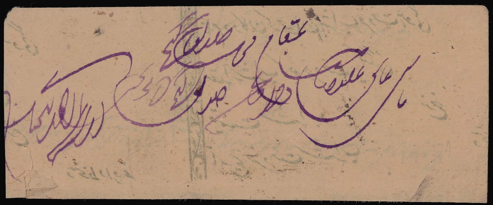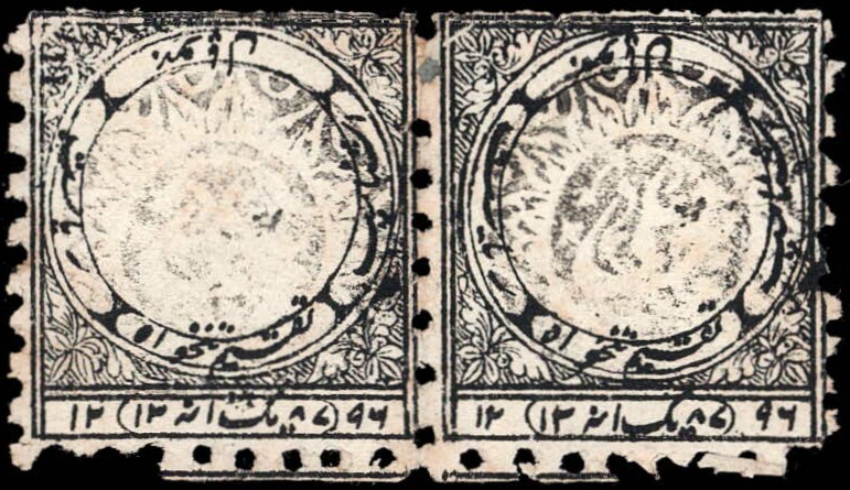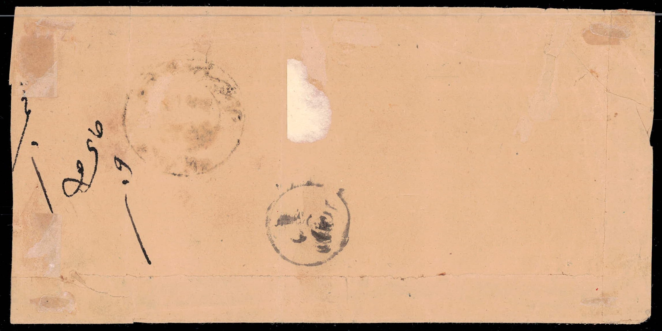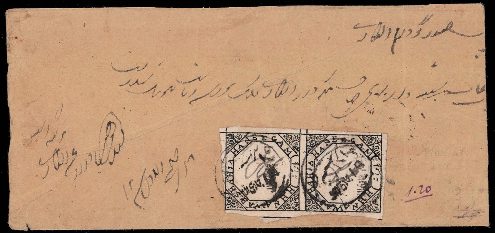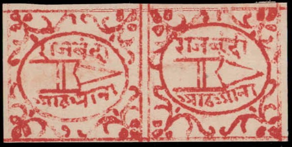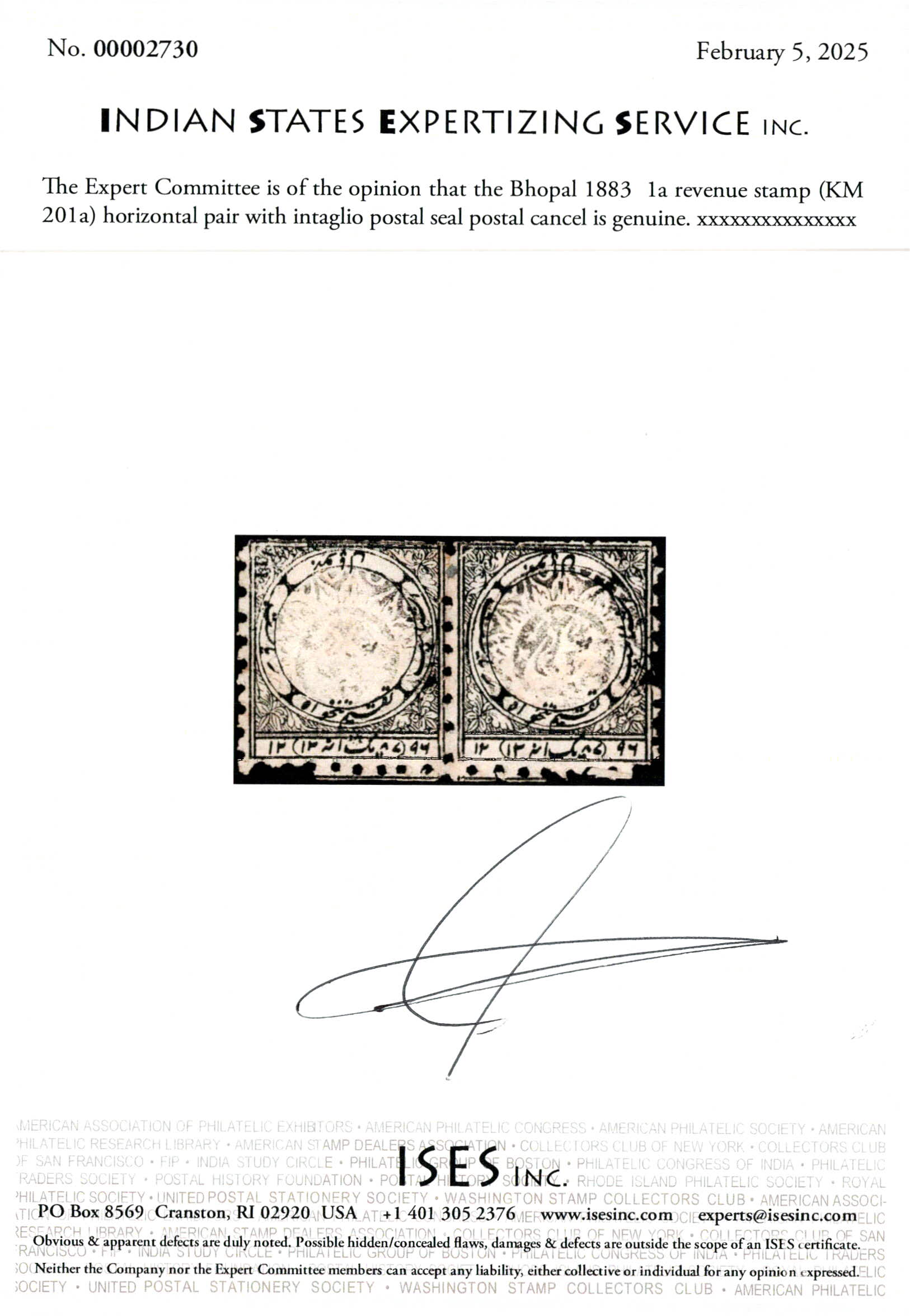 1883 1a revenue stamp (KM 201a) horizontal pair with intaglio seal postal cancel. Temporary shortage of 1 anna postage stamps resulted in the authorized usage of the 1 anna revenue stamp for a period of only two months. Besides this and a vertical pair, no other copies of this revenue stamp have been recorded postally used. Ex. Dan Walker collection. 2025 ISES certificate.