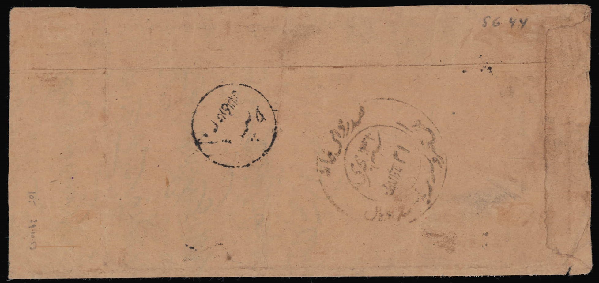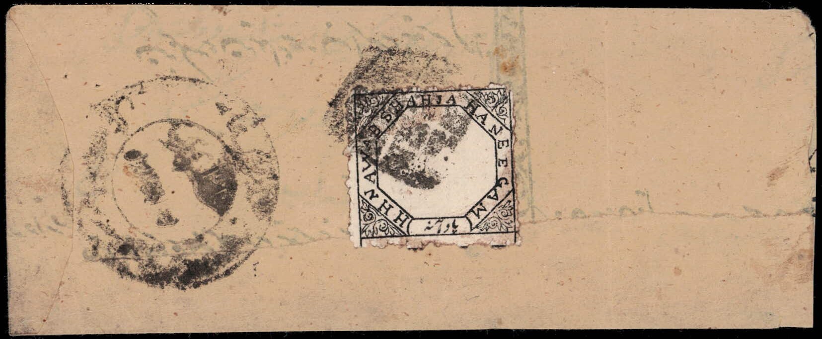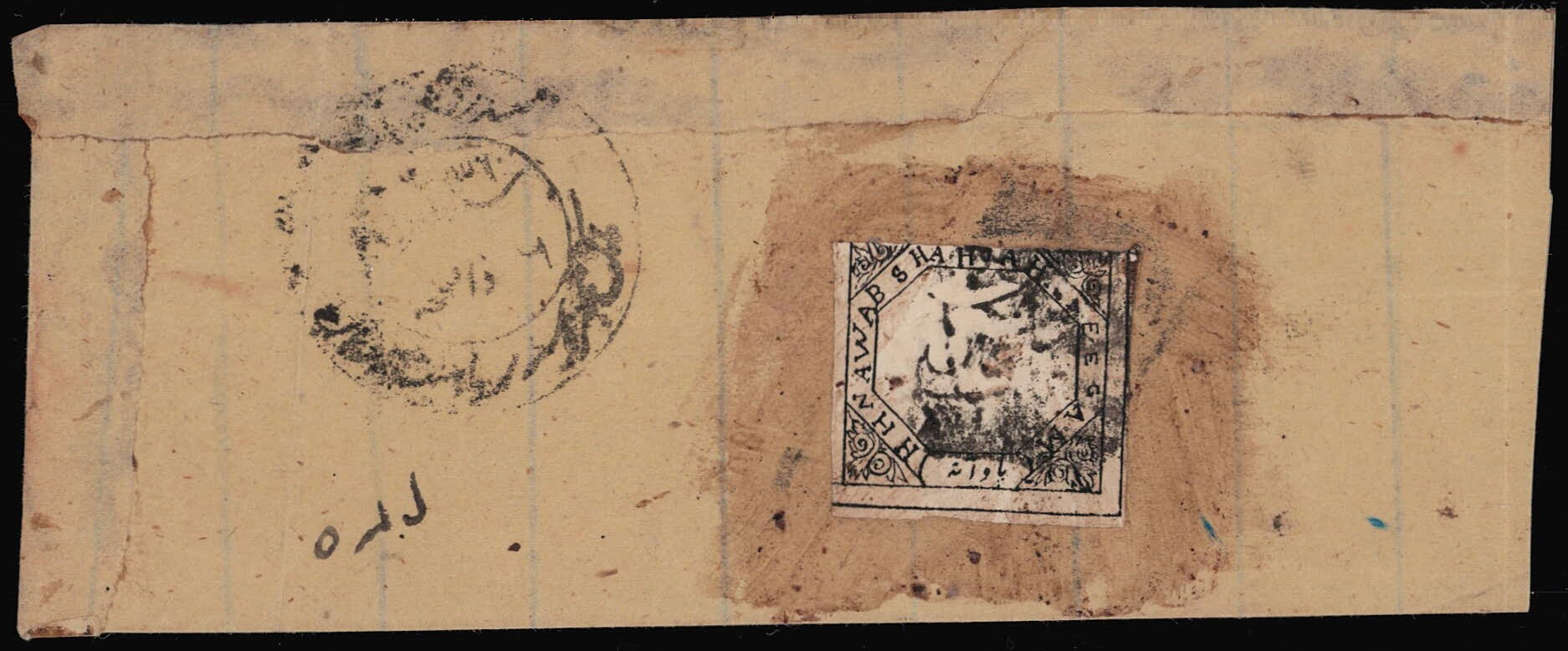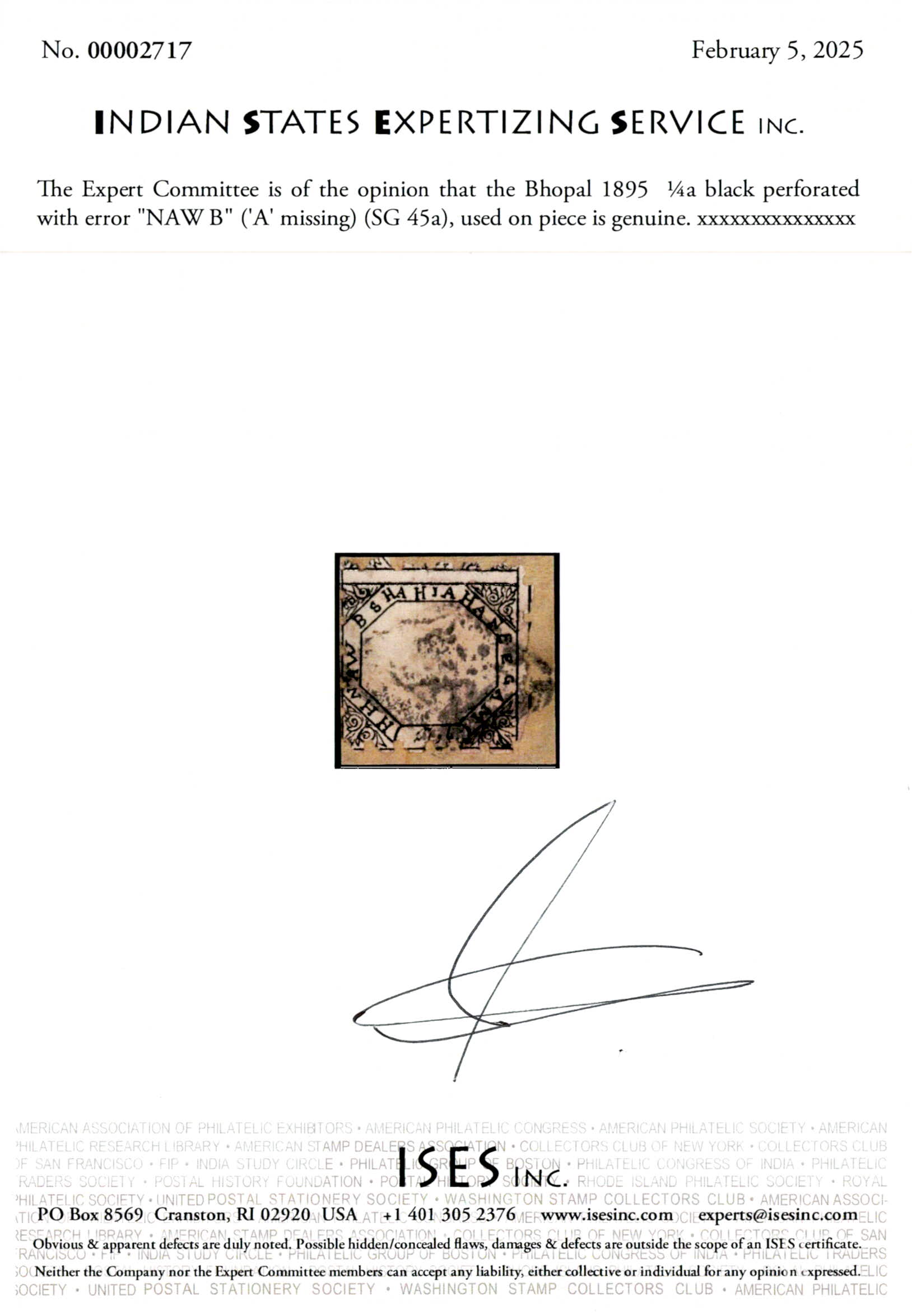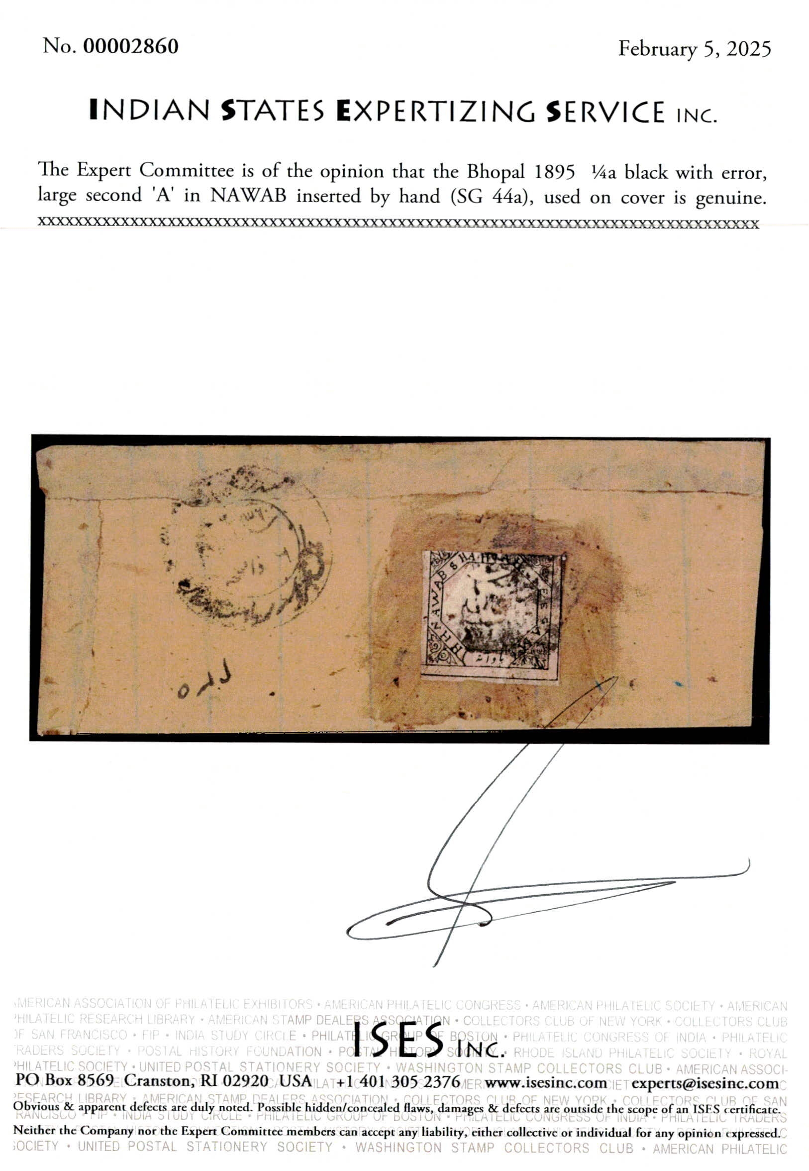 1895 ¼a black with error, large second 'A' in NAWAB inserted by hand on local cover tied by native cds. 2025 ISES certificate.