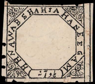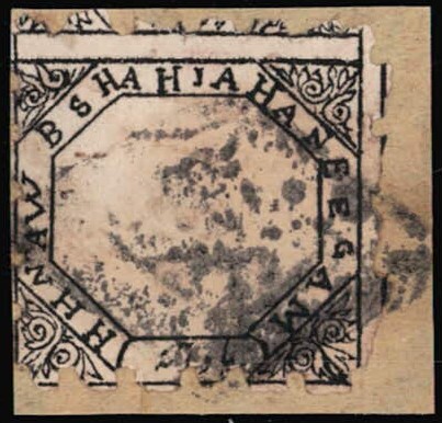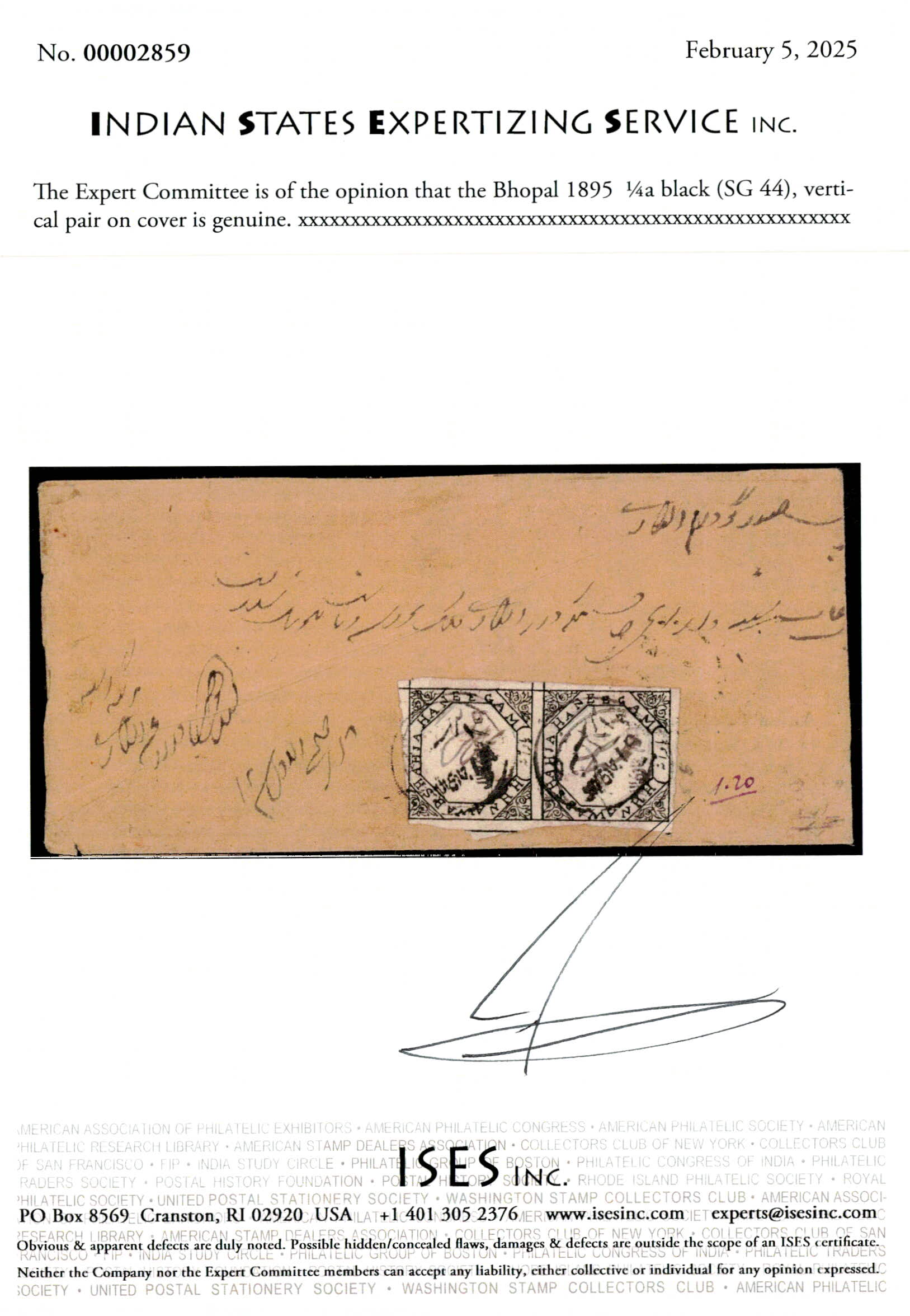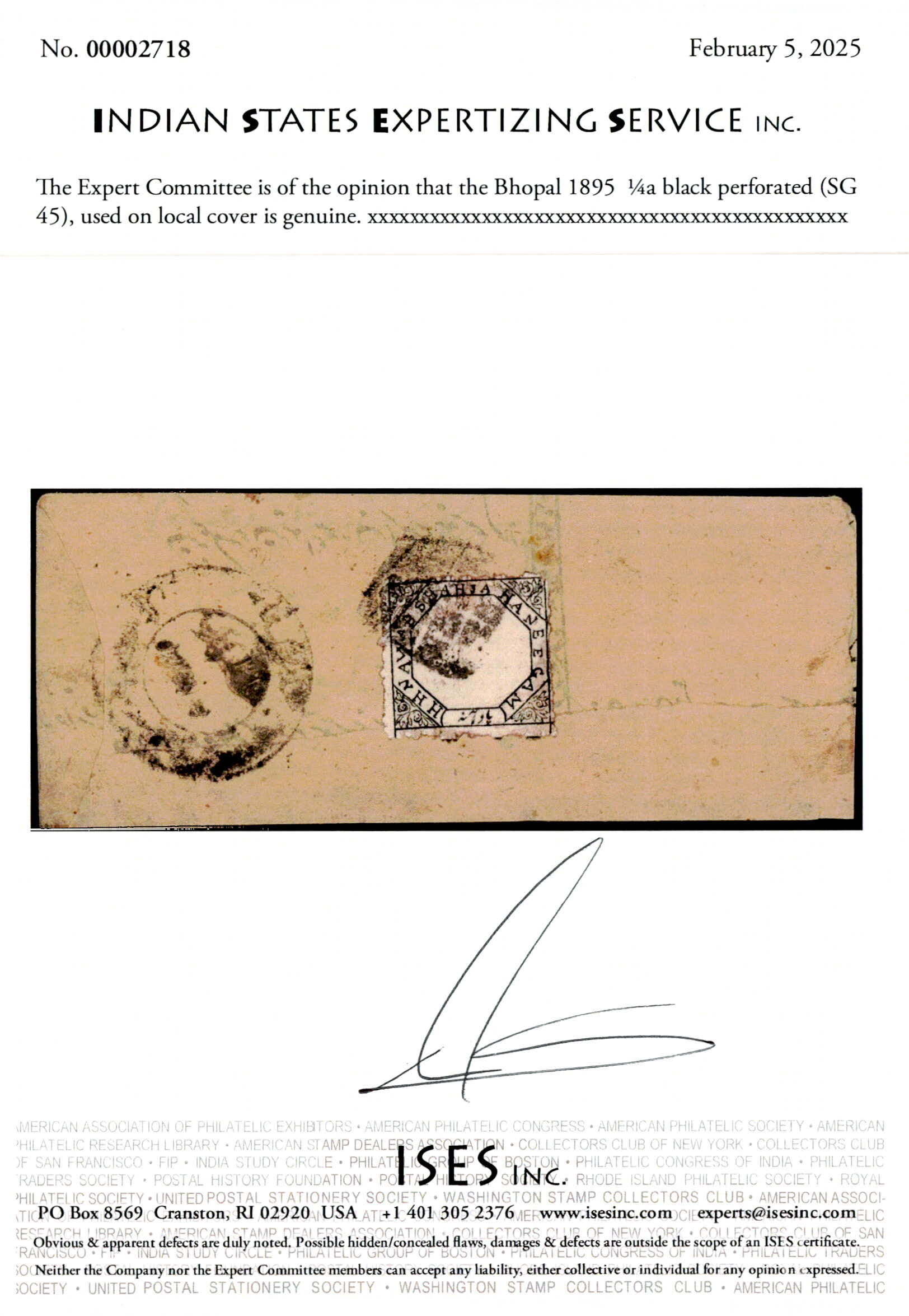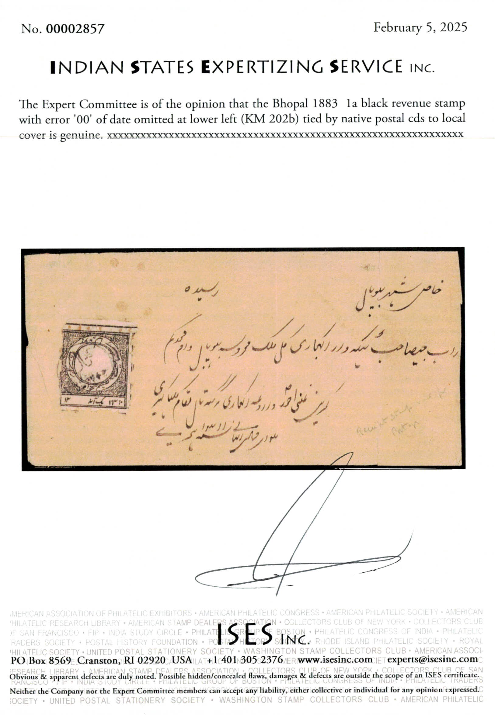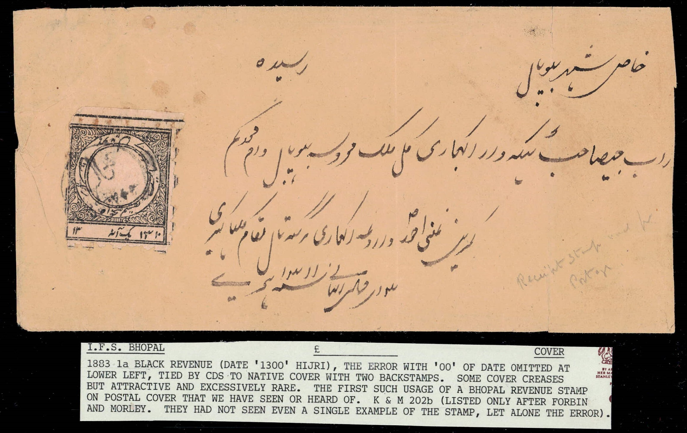 1883 1a black revenue stamp with error '00' of date omitted at lower left tied by native cds to local cover. Per Stanley Gibbons description card "The first such usage of a Bhopal Revenue stamp on postal cover that we have seen or heard of. K&M 202b (listed only after Forbin and Morley. They had not even a single example of the stamp, let alone the error)." Arguably the most important postal history item of Bhopal. Ex. Dan Walker collection. 2025 ISES certificate.