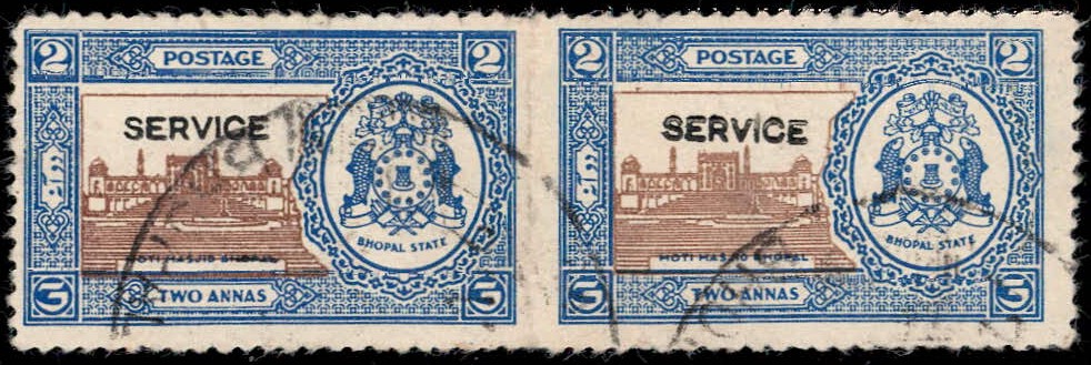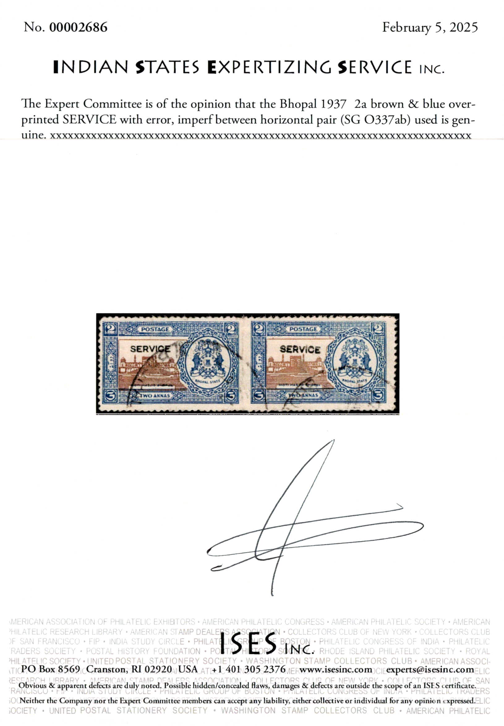 1937 2a brown & blue overprinted SERVICE with error, imperf between horizontal pair. 2025 ISES certificate.
