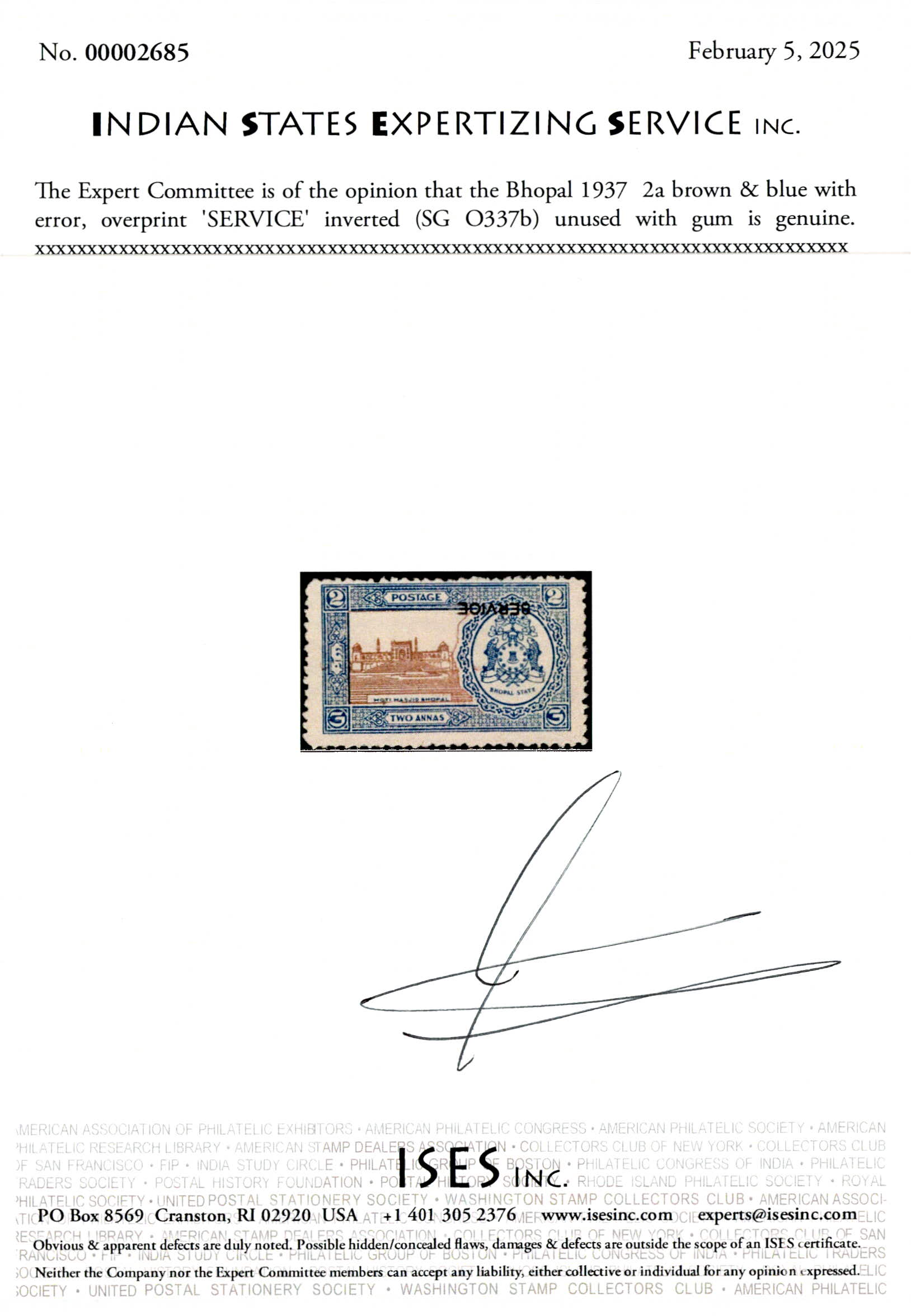 1937 2a brown & blue with error, overprint 'SERVICE' inverted. 2025 ISES certificate.