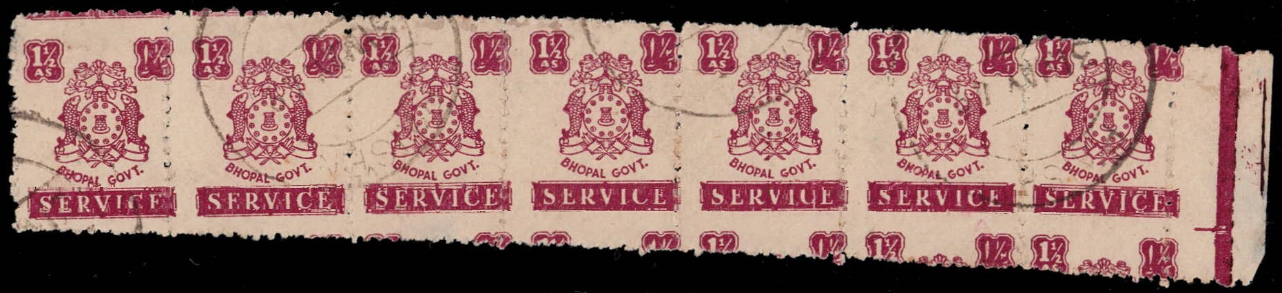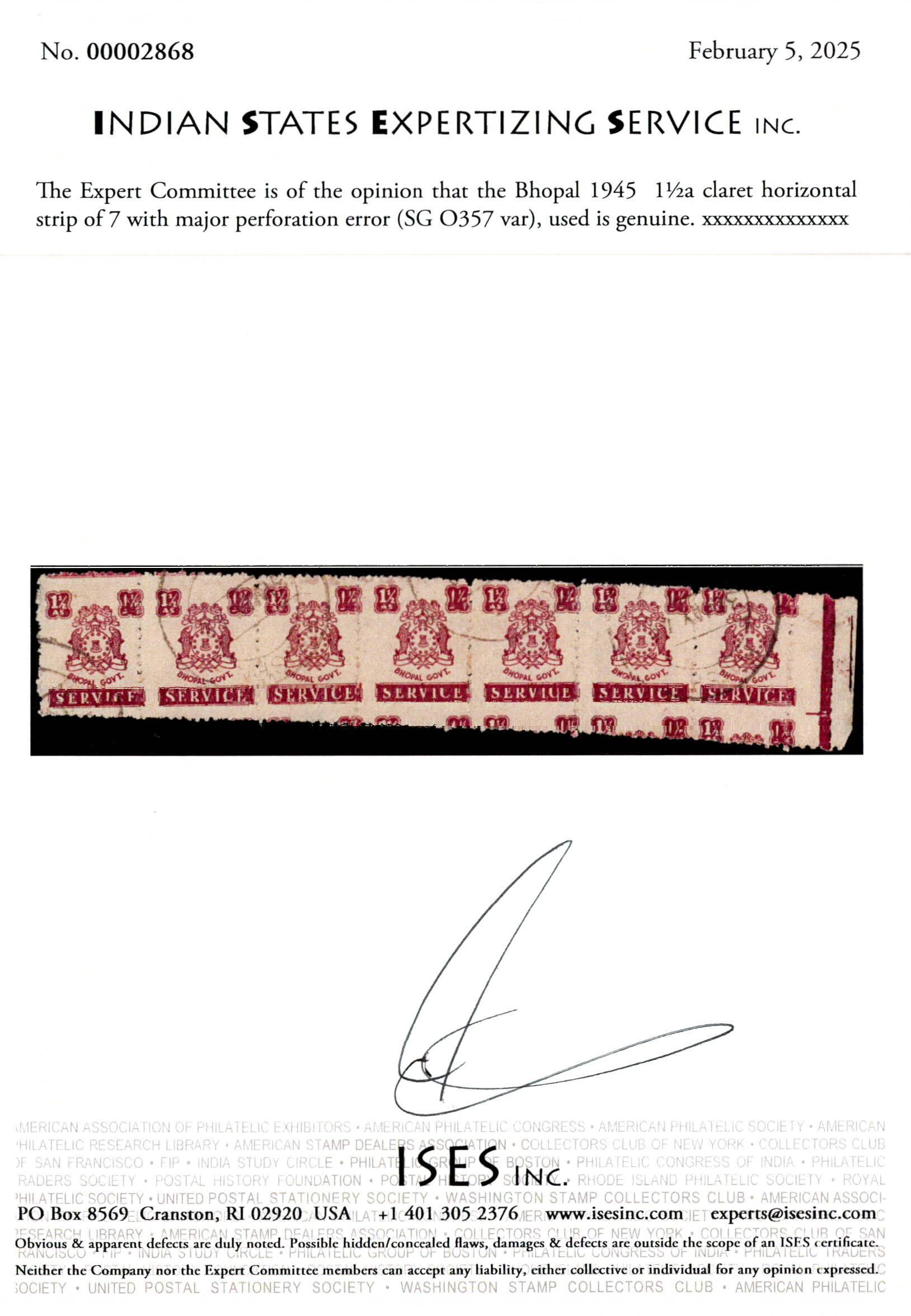 1945 1½a claret horizontal strip of 7 with major perforation error resulting in gradual increase of the height of the stamps ending with the right stamp 7mm taller. Ex. Dan walker collection. 2025 ISES certificate.